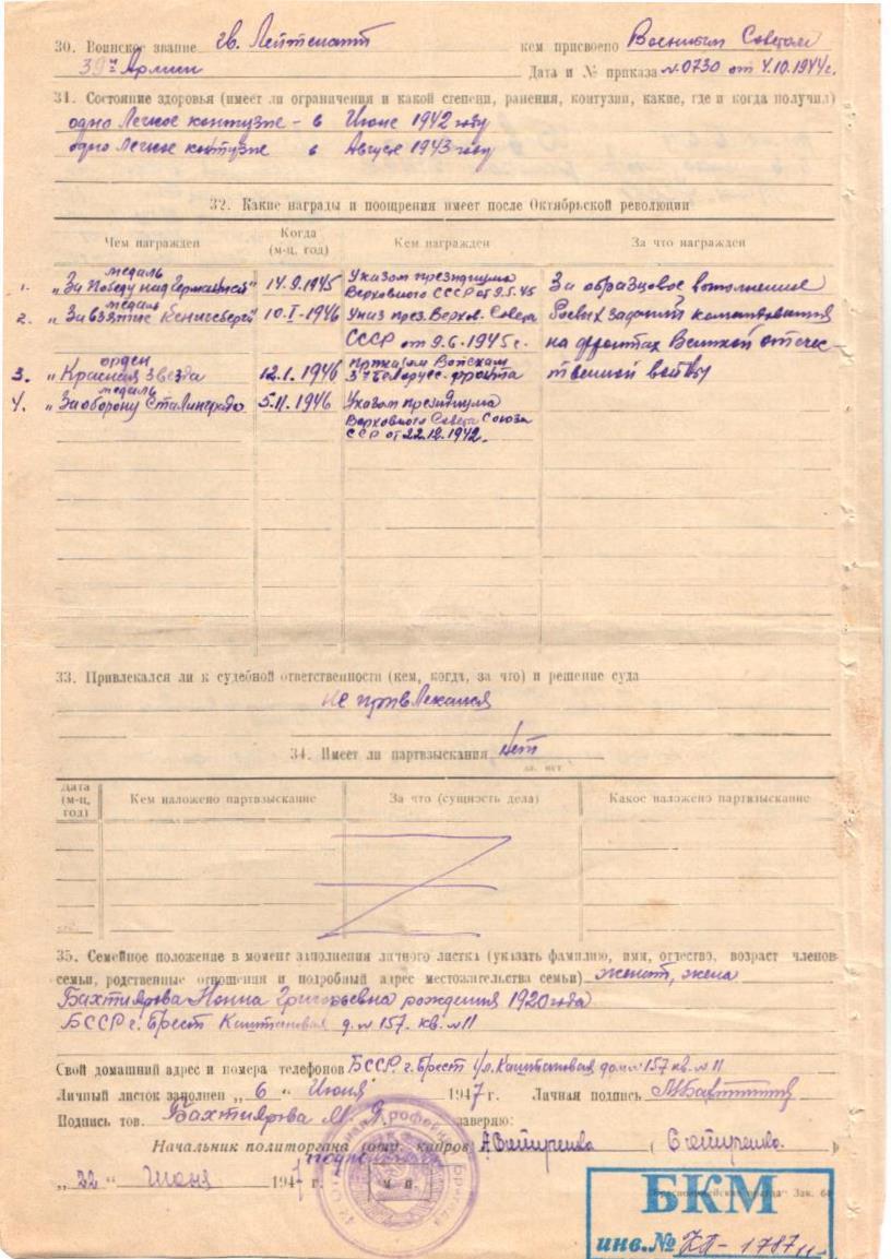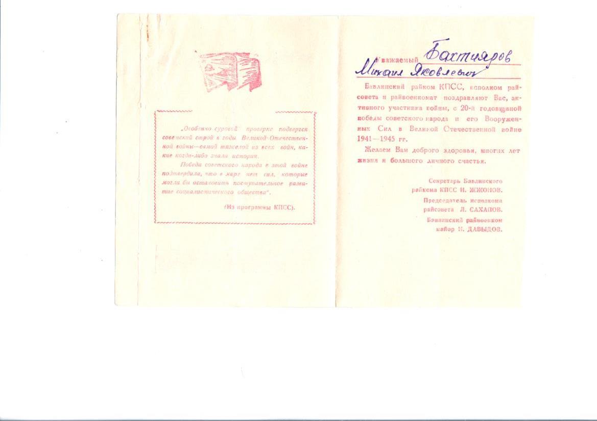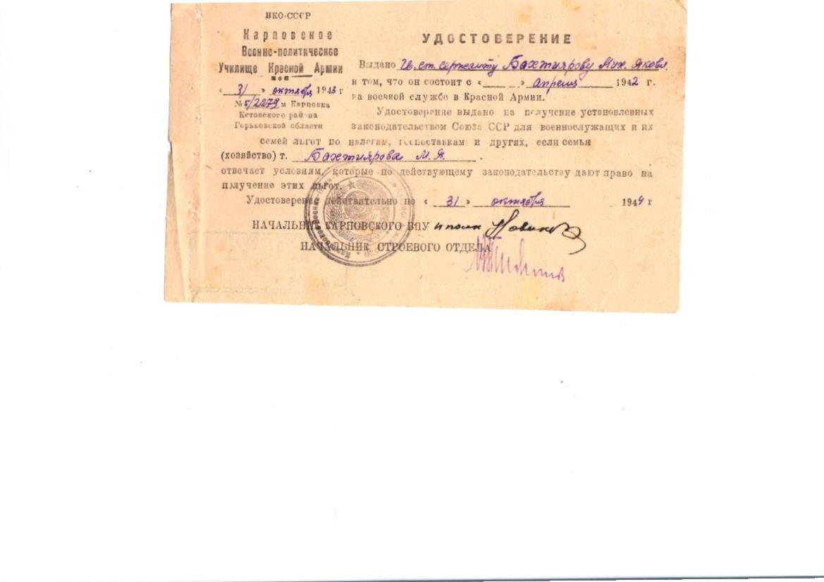 Я, Бахтияров Михаил Яковлевич рождения 2-го сентября 1917 года. Уроженец деревни Николашкино Бавлинского района Татарской АССР. По социальному происхождению из семьи крестьян. Родители до октябрьской Революции 1917 года занимались крестьянством, имели бедняцкое хозяйство.
