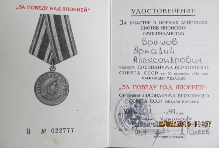 БРЕХОВ Аркадий Александрович родился 25 августа 1927 года в селе Байки Караидельского района Башкирии. После окончания 7 классов поступил учиться в педагогическое училище, где окончил два курса. В начале военной службы прошел обучение в Иркутском отдельном учебном полку. В 1945 году на эшелонах был переправлен в город Чиеболсан, что в Монголии. Служил разведчиком-наблюдателем в 35-ой истребительной противотанковой бригаде. Во время боевых действий его отделение, в основном, находилось на переправе рек. Хотя война с японцами завершилась в сентябре 1945 года, Брехов А.А. участвовал в операциях по уничтожению банд до марта 1946 года. За участие в боевых действиях против Японии он награждён медалью « За победу над Японией».