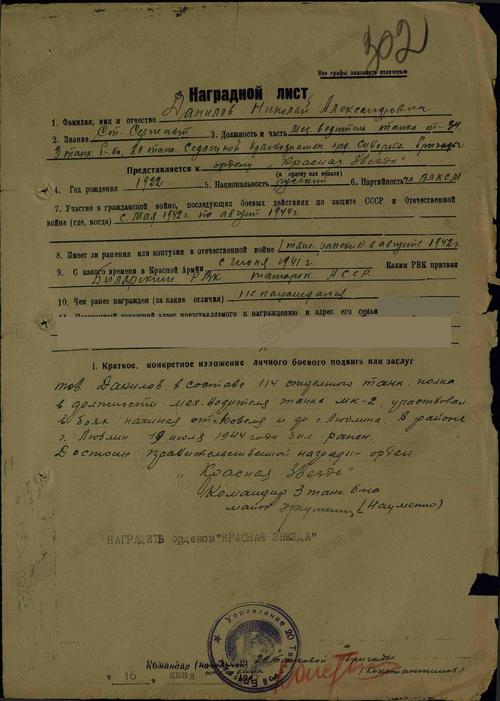 ДАНИЛОВ Николай Александрович, 1922, с. Ерыкла. В армию мобилизован в 1941г. Билярским РВК. Воевал механиком-водителем танков МК-2 в 114 отдельном танковом полку и Т-34 в 20 ТБр. Ст. сержант. В августе 1942 г. был тяжело ранен, вторично ранен в июле 1944 г. Награждён орденом Красной Звезды (1945) и Отечественной войны 2 ст. (1985). Демобилизован в 1945 г. После войны жил в с. Арбузов Баран. Работал бригадиром в колхозе "Волна революции".