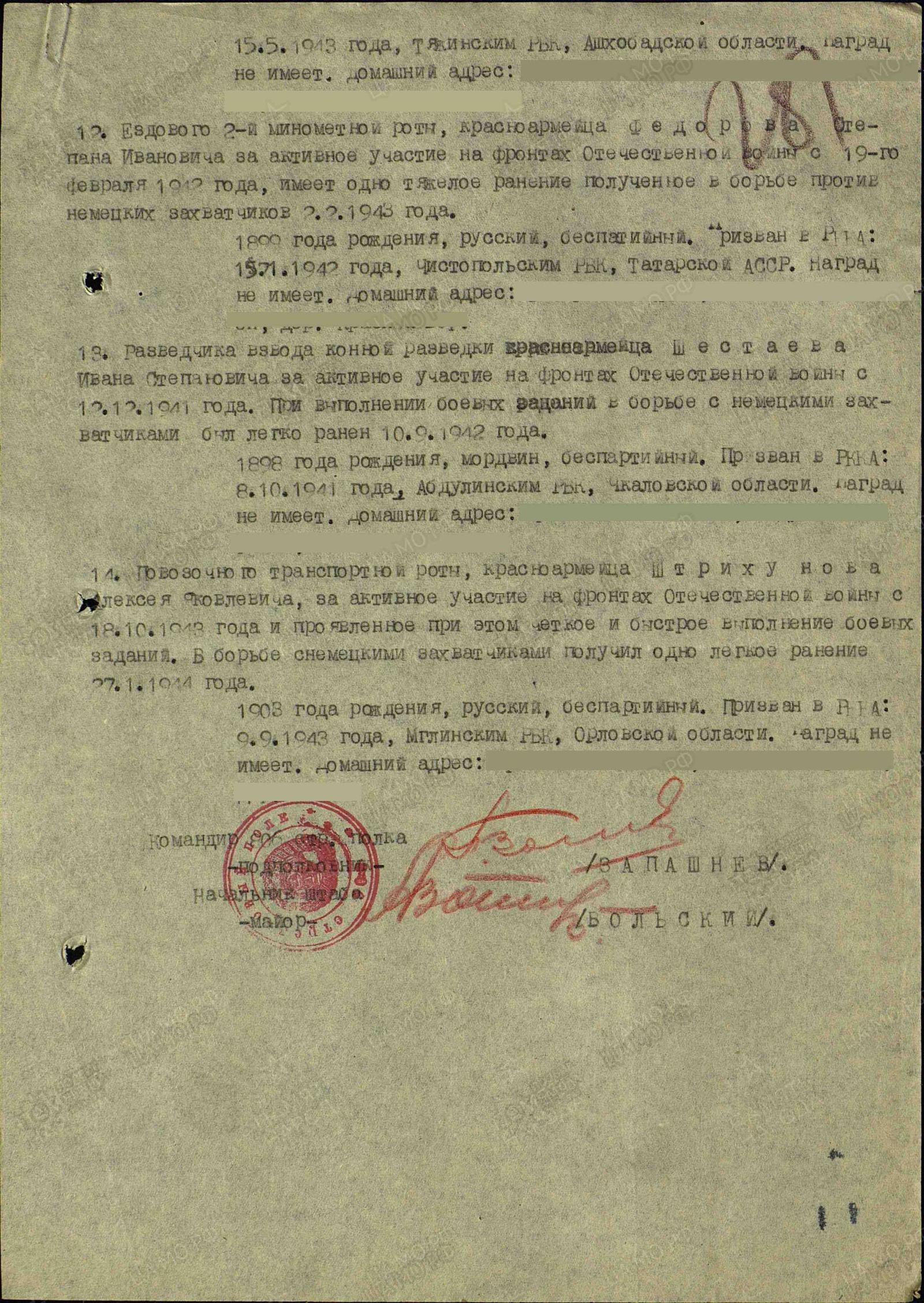 стрелок Фёдоров С.И. В справке Центрального архива Министерства обороны от 19.05.1998 г. указано, что гвардии рядовой Фёдоров Степан Иванович был награждён медалью «За отвагу» (приказ от 26.04.45г.), орденом Отечественной войны 1 степени (приказ от 18.05.45г.). Награды после войны вручены его сыну.