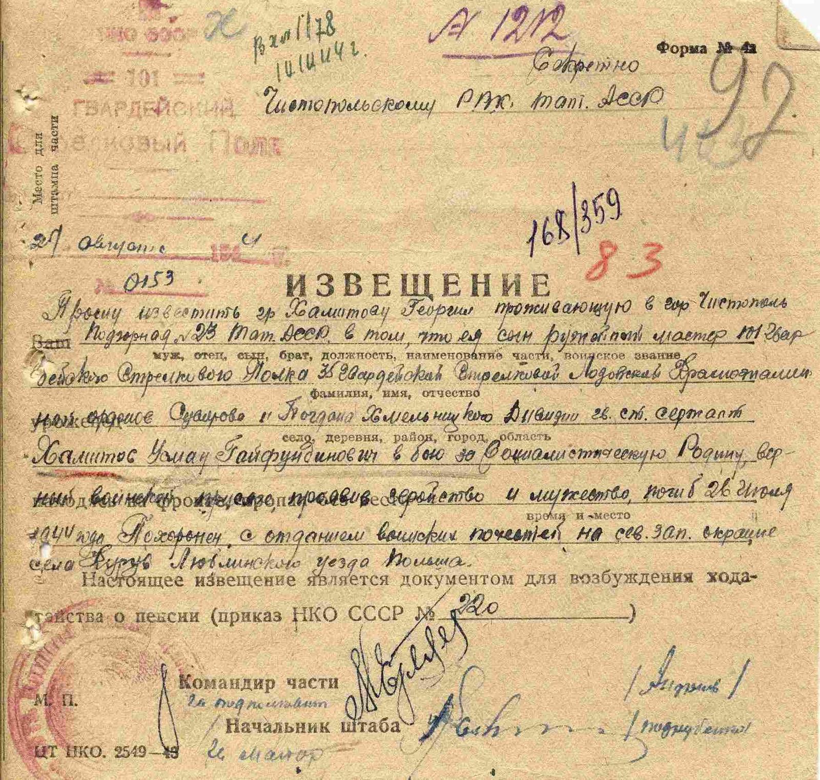 26.07.1944 г. погиб в бою, похоронен в Польше, Люблинский уезд, с.Куру, северо-западной окраине п.Курув, захоронение 86232274.