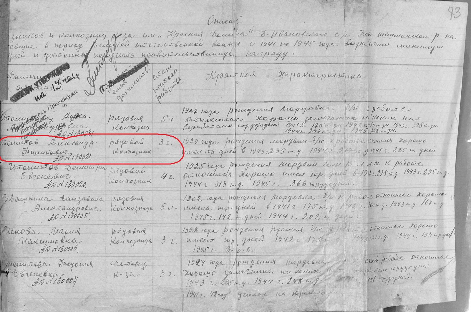 Иполитов Александр Филиппович родился в 1929 году. Место жительства: д.Дальняя Ивановка Ново-Шешминский район ТАССР (ныне Альметьевский район РТ). В годы Великой Отечественной войны работал в колхозе "Красная Долина" рядовым колхозником. Награжден медалью "За доблестный труд в Великой Отечественной войне 1941–1945 гг." (Акт от 28 апреля 1947 г, фонд 3610, опись 2, дело № 325, лист 73, № 130021).