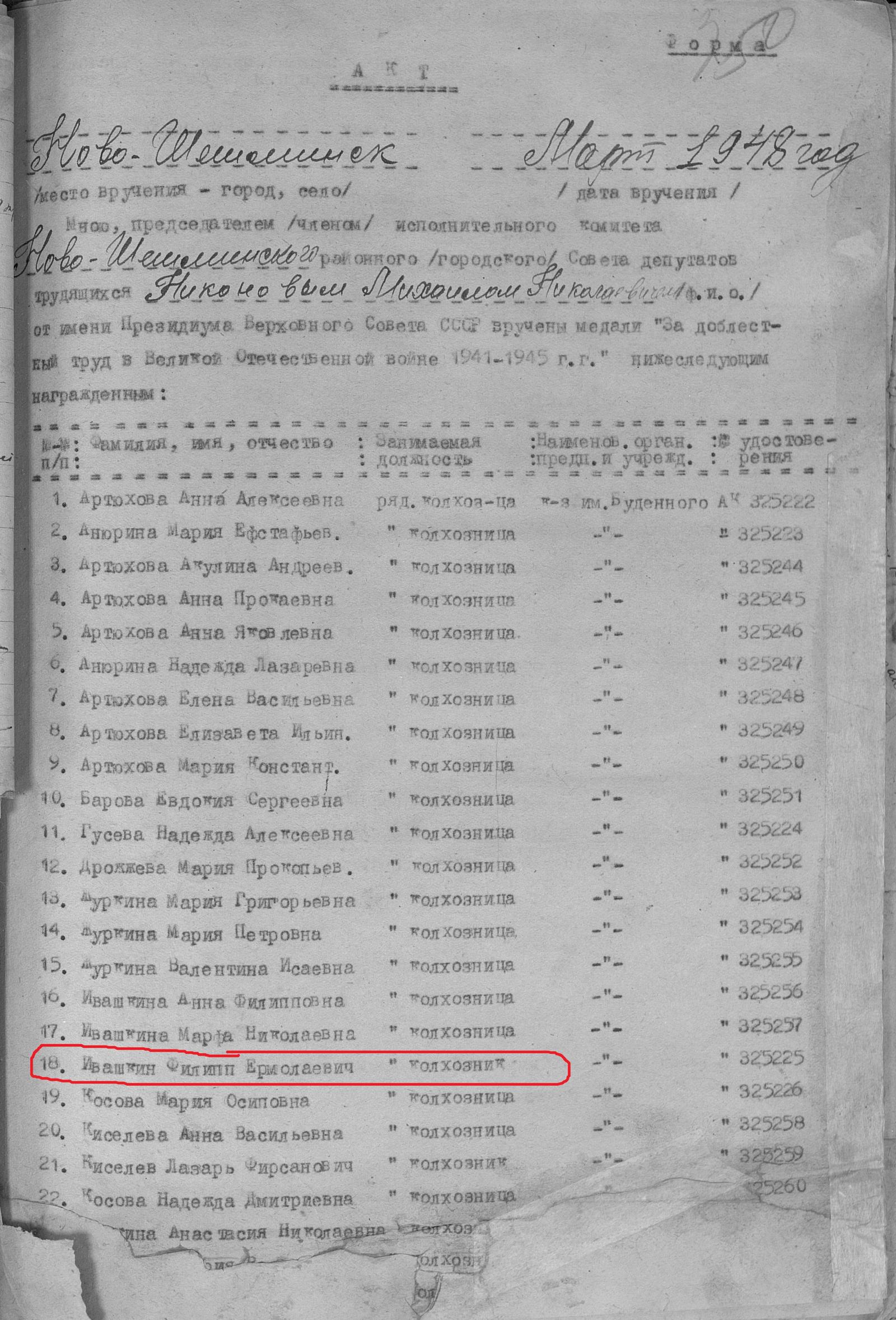 Ивашкин Филипп Ермолаевич родился в 1885 году. Место жительства: д.Дальняя Ивановка Ново-Шешминский район ТАССР (ныне Альметьевский район РТ). В годы Великой Отечественной войны работал в колхозе им.Буденого рядовым колхозником. Награжден медалью "За доблестный труд в Великой Отечественной войне 1941–1945 гг." (Акт от 20 февраля 1946г., Фонд 3610, опись 2, дело № 470, лист 250, АК № 325225).