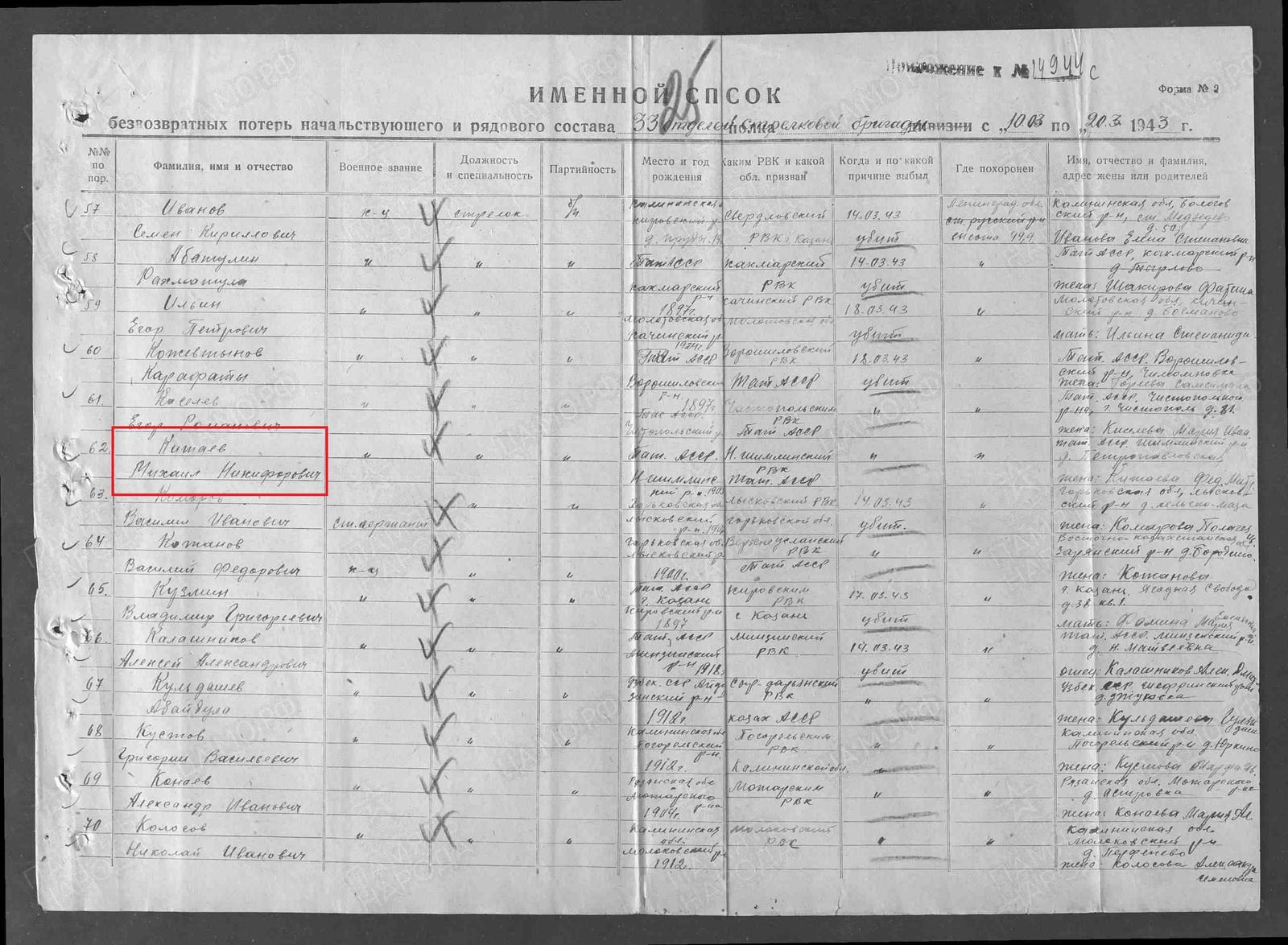 Китаев Михаил Никифорович родился в 1905 году в с.Слобода Петропавловская Казанской губернии Чистопольского уезда Новошешминской волости. Призван Новошешминским РВК, кр-ц, 33 осбр, погиб 18.03.43 г. Место захоронения: Новгородская обл.,Старорусский р-н,д.Краснодубье,выс.49,9.