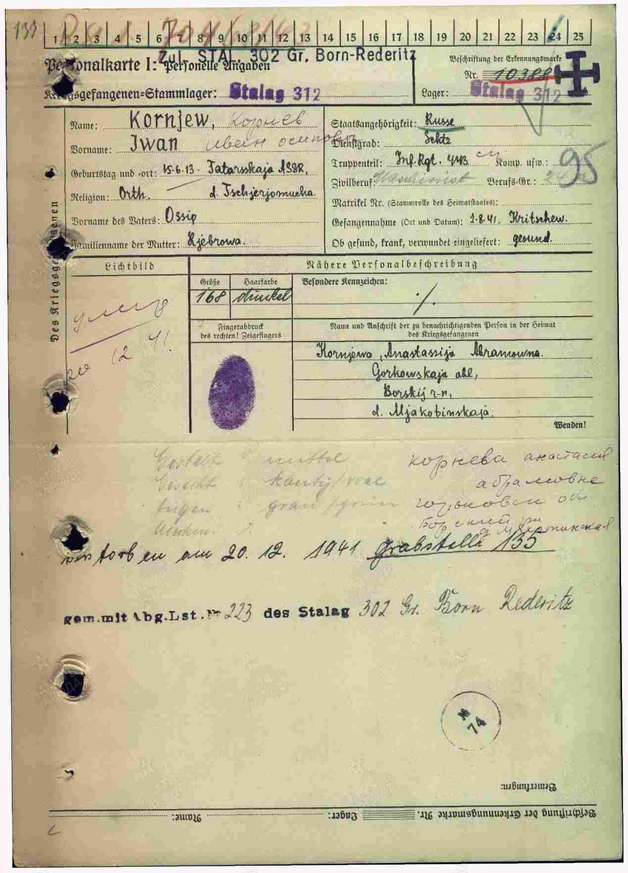 КОРНЕВ ИВАН ОСИПОВИЧ родился в 1913 году в с.Сл.Черемуховая Казанской губернии Чистопольского уезда Новошешминской волости. (ныне с.Слобода Черемуховая Новошешминского района РТ). Мобилизован Новошешминским РВК,кр-ц,443 сп,. Причина смерти: погиб в плену 20.12.41.г. Место захоронения: Германия, г.Гросс Борн Редериц,шталаг ХХ С(312),попал в плен 08.41 р-н Кричева.