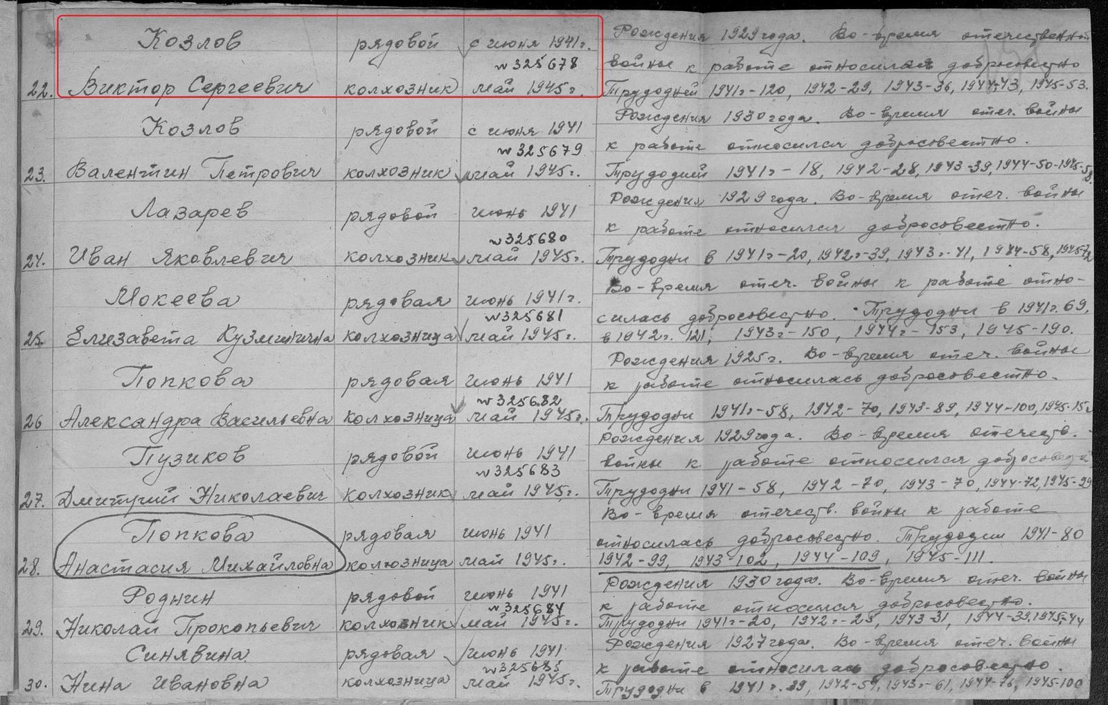 Козлов Виктор Сергеевич родился в 1929 году. Место жительства: с.Новошешминск Ново-Шешминский район ТАССР. В годы Великой Отечественной войны работал в колхозе им. Чкалова рядовым колхозником. Награжден медалью "За доблестный труд в Великой Отечественной войне 1941–1945 гг." (Акт от 28 апреля 1947 г, фонд 3610, опись 2, дело № 470, лист 174, АК № 325678).