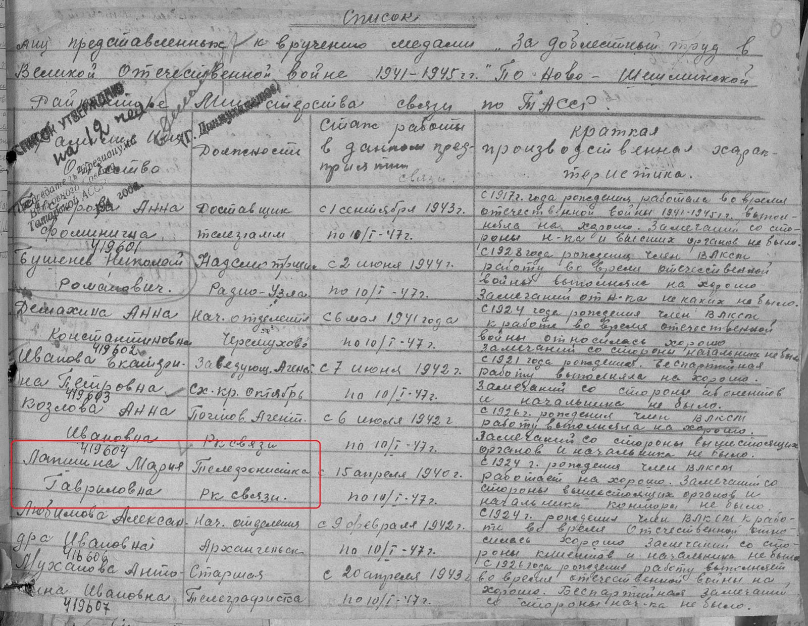 Лапшина Мария Гавриловна родилась в 1924 году. Место жительства: Ново-Шешминский район ТАССР. В годы Великой Отечественной войны в Райконторе министерство связи Ново-Шешминского района телефонисткой. Награждена медалью "За доблестный труд в Великой Отечественной войне 1941–1945 гг." (Акт от 28 апреля 1947 г, фонд 3610, опись 2, дело № 325, лист 6, .№ 419605).