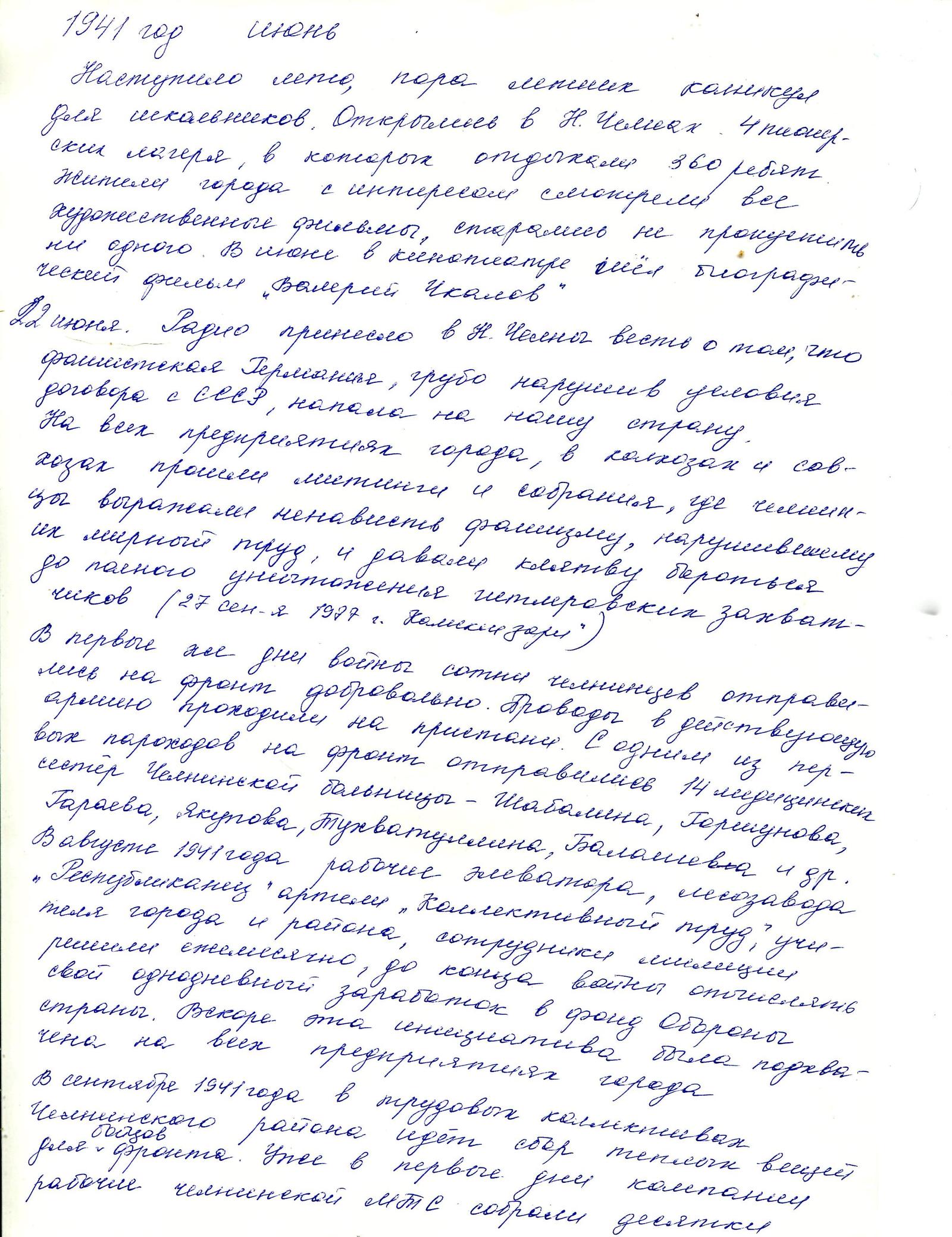 "С 1938 года начался трудовой стаж. В 1941-1945 гг. работала в колхозе "Красные Челны". Село было большое (более 60 дворов), дома деревянные, срубные, улицы длинные. В селе была 4-классная школа, церковь из красного кирпича, клуб деревянный, сельсовет, фермы (коровы и овцы), небольшой конный двор, деревянные хлебные склады.