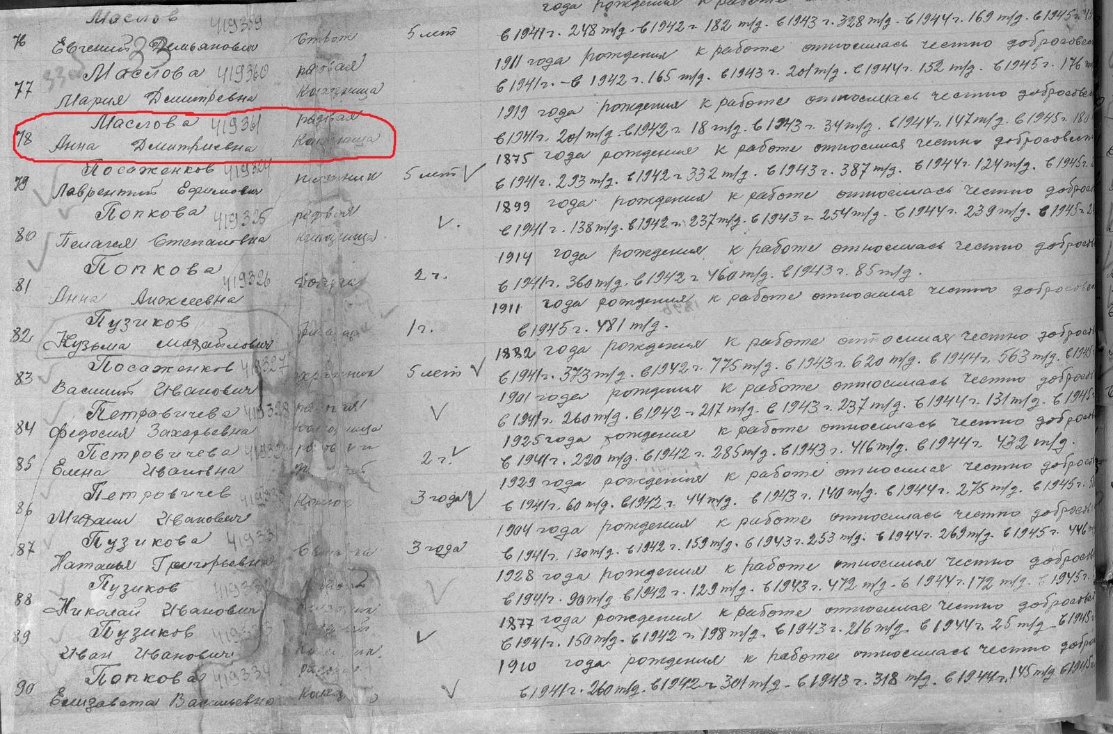 Маслова Анна Дмитриевна родилась в 1919 году. Место жительства: с.Ново-Шешминск Ново-Шешминский район ТАССР. В годы Великой Отечественной войны работала в колхозе «Красный Октябрь» рядовой колхозницей. Награждена медалью "За доблестный труд в Великой Отечественной войне 1941–1945 гг." (Акт от 28 апреля 1947 г, фонд 3610, опись 2, дело № 325, лист 33, № 419361).
