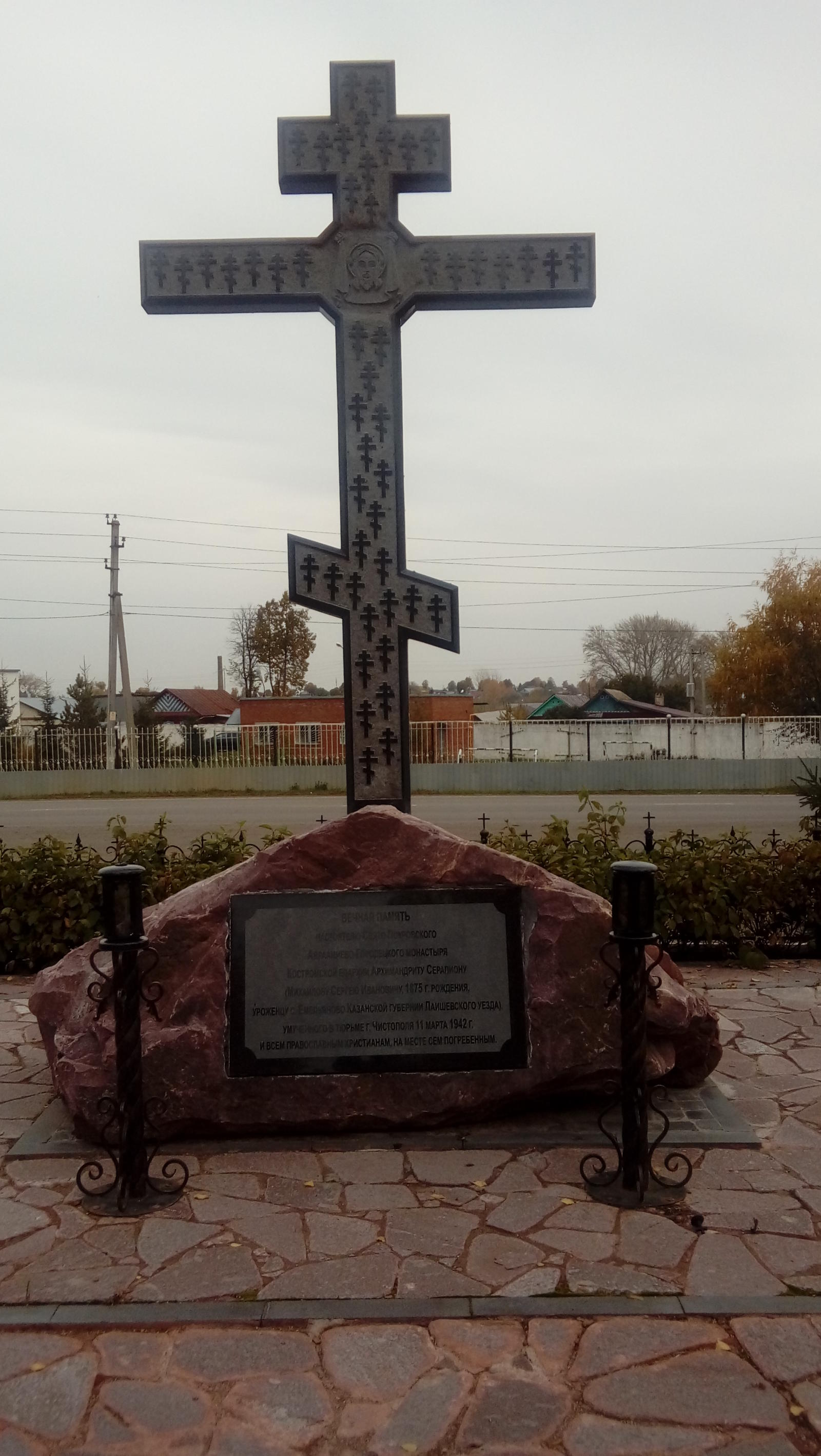 За металлической оградой с левой стороны вымощенной прямоугольной площадки расположен монумент, который представляет собой трехметровый крест, установленный на большом гранитном камне. Табличка гласит: «Вечная память настоятелю Свято-Покровского и Авраамиево-Городецкого монастыря Костромской епархии Архимандриту Серапиону (Михайлову Сергею Ивановичу, 1875 года рождения, уроженцу с.Емельяново Казанской губернии Лаишевского уезда) умученного в тюрьме г.Чистополя 11 марта 1942 года и всем православным, на месте сем погребенным».