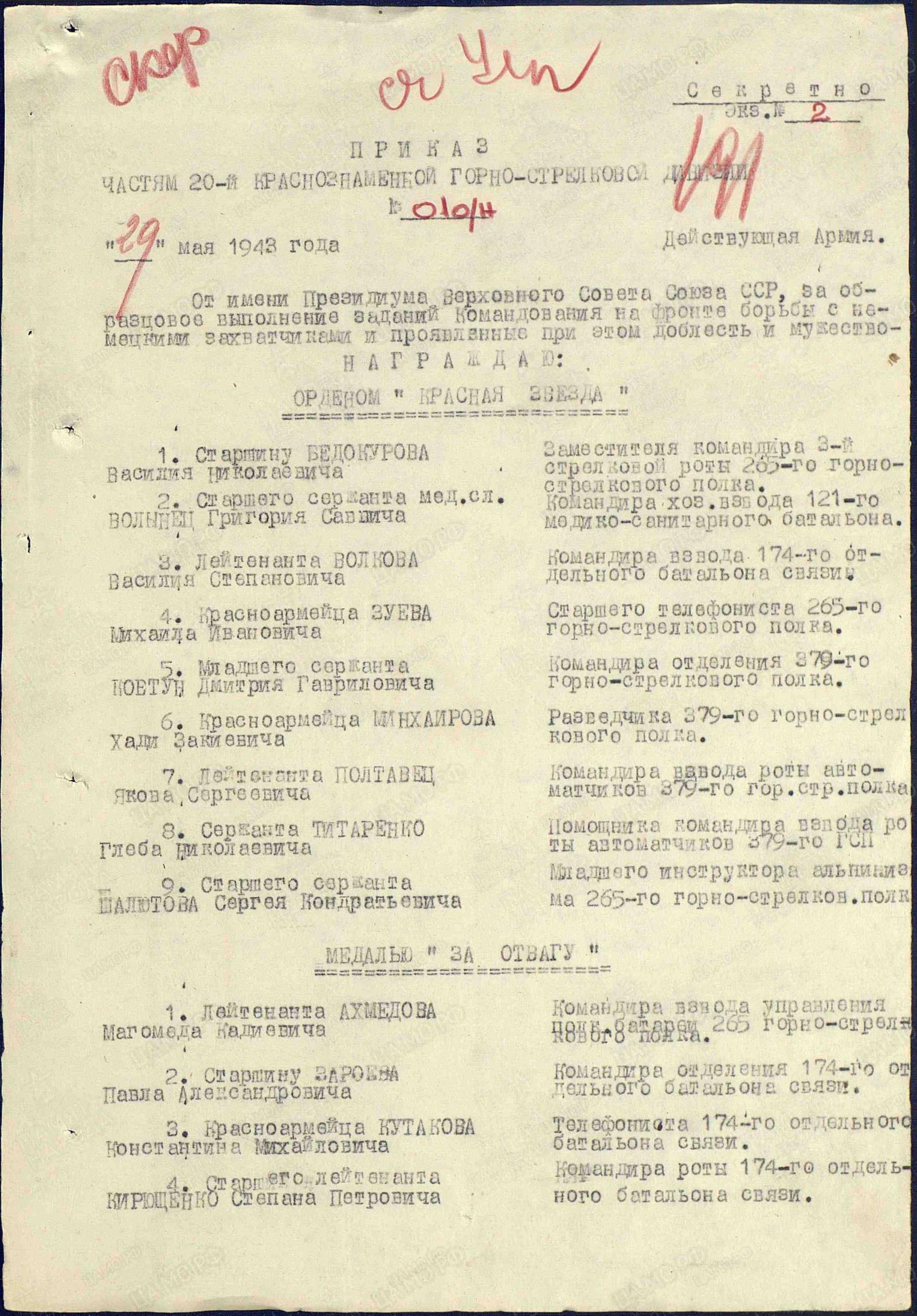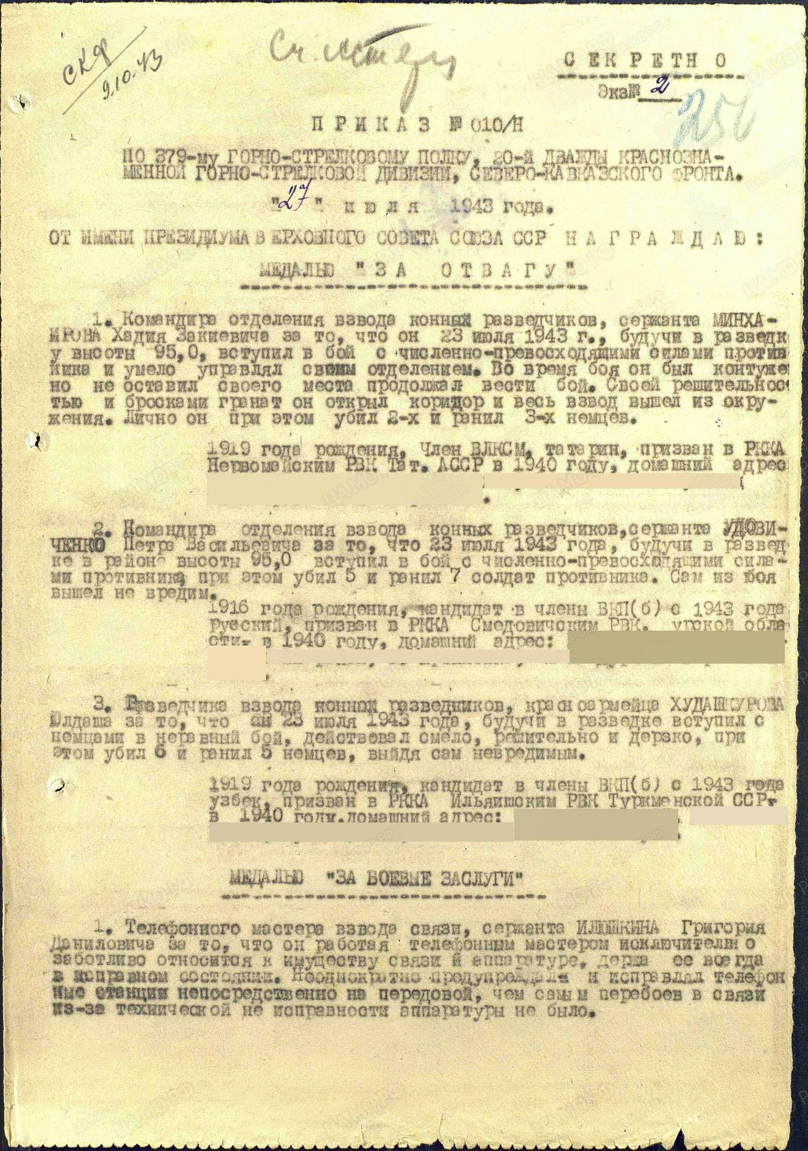 Командир взвода конных разведчиков, сержант Минхаеров Х.З. 23.07.1943 г. будучи в разведке у высоты 95,0 вступил в бой с численно - превосходящими силами противника и умело управлял своим отделением. Во время боя он был контужен, но не оставил своего места продолжал вести бой. Своей решительностью и бросками гранат он открыл коридор, и весь взвод вышел из окружения. Лично он при этом убил двух и ранил трех немцев. За проявленное мужество 27.07.1943 г. был награжден медалью « За отвагу». 18.09.1943 г. был убит. Захоронен в Краснодарском крае Крымский р-на, Горищный с/с, х. Горищный, восточнее, 4500 м, в районе ж/д тоннеля.