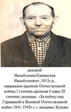 Насыйбуллин Калимулла Насыйбуллович родился 5 марта 1911 года в деревне Старые Салманы Алькеевского района ТАССР. Фронтовик. Участник Великой Отечественной войны 1941-1945гг. Призван Алькеевским РВК ТатАССР в 1942 году. Награжден орденом Отечественной войны I степени, орденом Славы III степени, медалью "За победу над Германией в Великой Отечественной войне 1941-1945г.г.",медалью Жукова. Умер 7 сентября 1997 года. (Фотография и материалы предоставлены Старосалмановским сельским поселением)