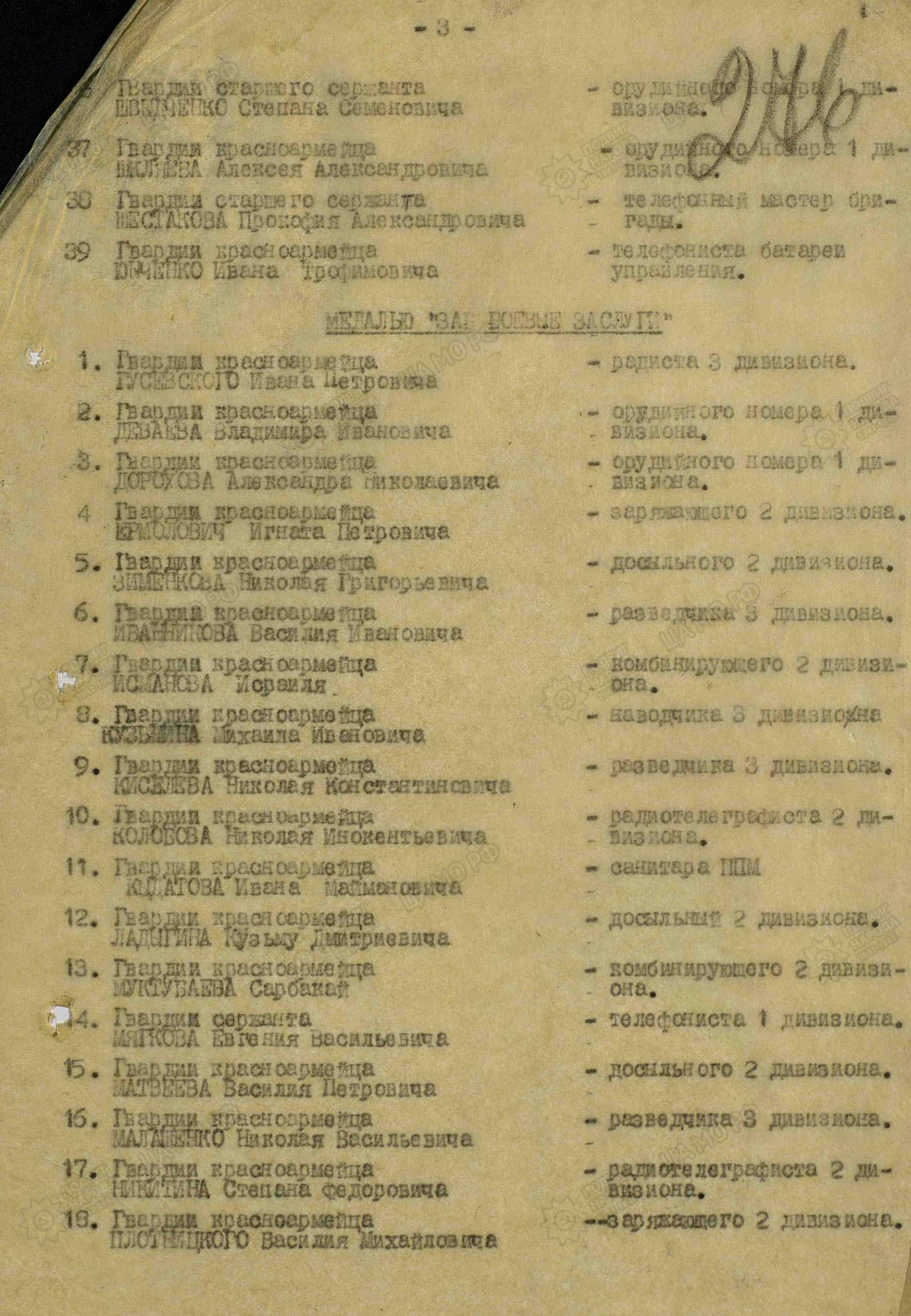 В Великой Отечественной войне Советского Союза против фашисткой Германии дивизия, в том числе и Вы, за отличные боевые действия получили от Верховного Главнокомандующего Маршала Советского Союза Сталина следующие благодарности: