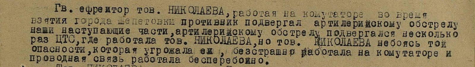 НИКОЛАЕВА Мария Федоровна родилась 13 марта 1920 года в деревне Козловка Буинского района Татарии. В 1939 году окончила Буинское медицинское училище. В ряды Красной Армии призвана в августе 1941 года. Служила связисткой-телефонисткой в подразделениях связи 18-го гвардейского стрелкового корпуса, 8-го запасного стрелкового полка, 379-го отдельного гвардейского батальона связи, 128 гвардейского стрелкового полка. Боевой путь ветерана начался на Курской дуге и, пройдя всю Европу, она встретила Победу под Кенигсбергом. После короткой передышки войска, где служила ефрейтор Николаева, были переброшены на Дальний Восток и приняли участие в разгроме японских захватчиков. На передовых позициях была и связист Мария Николаева. Она оставалась на службе еще некоторое время и была демобилизована в ноябре 1945 года. За образцовую, безупречную службу награждена медалями "За боевые заслуги”, "За взятие Будапешта", "За взятие Вены”, "За победу над Германией в Великой Отечественной войне 1941-1945 г.г.”, "За победу над Японией" и 18 юбилейными медалями и знаками.