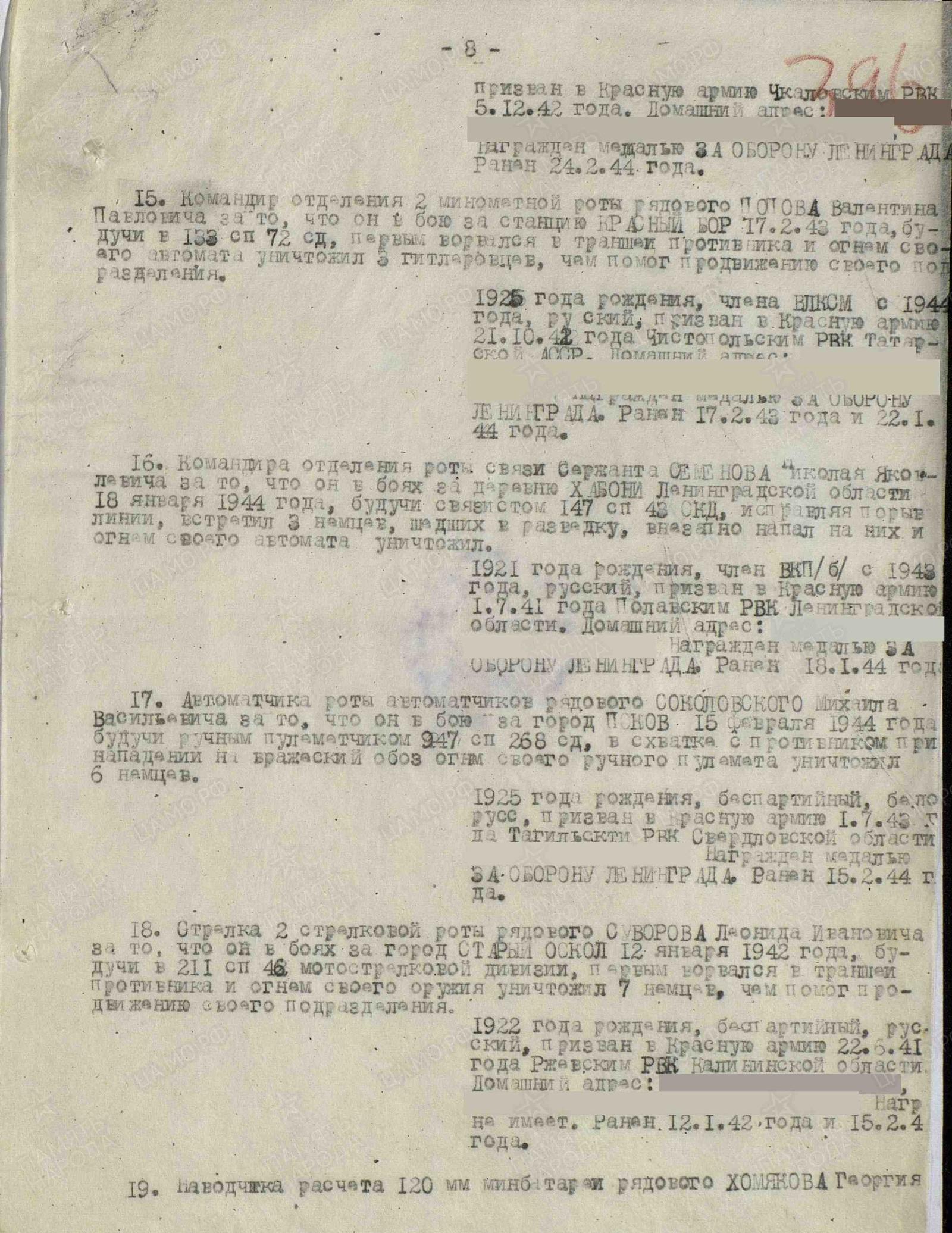 Из наградного списка: «Командира отделения 2 минометной роты рядового Попова Валентина Павловича за то, что он в бою за станцию Красный Бор 17.02.1943 г., будучи в 133 СП 72 СД, первым ворвался в траншеи противника и огнем своего автомата уничтожил 3 гитлеровцев, чем помог продвижению своего подразделения»