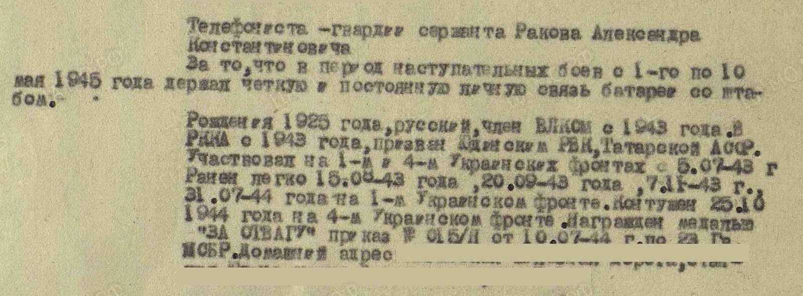 РАКОВ Александр Константинович, 1925, с. Караваево. Мобилизован Юдинским РВК 8 января 1943 г. Гв. сержант, командир отделения 23 гв. МСБр 7 гв. ТК 3 гв. ТА Центрального, Воронежского, 1 Укр. Фронтов. Имел 4 лёгких ранения: 15 авг. 1943, 20 сент. 1943, 7 нояб. 1943, 31 июля 1944, контужен 25 окт. 1944. Награждён медалью "За отвагу". В 1945 г. - телефонист батареи 1646 истребительно-противотанкового арт. полка 4 Укр. Фронта. Награждён медалью "За боевые заслуги".