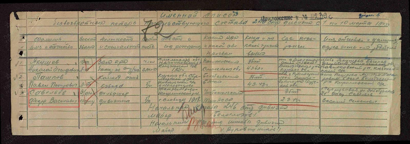 САВЕЛЬЕВ ФЕДОР ВАСИЛЬЕВИЧ родился в 1918 году в с.Сл.Черемуховая Казанской губернии Чистопольского уезда Новошешминской волости. (ныне с.Слобода Черемуховая Новошешминского района РТ). Мобилизован Чистопольским РВК,в/фельдшер,915 сп,246 сд. Причина смерти: убит. Дата выбытия: 02.03.43.г. Область выбытия: Курская обл., Дмитриевский р-н,Пролетарский(Моголь.