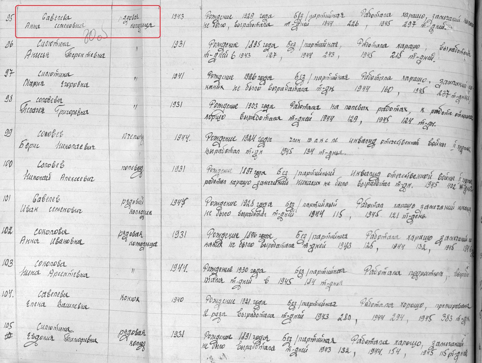 Савельева Анна Семеновна родилась в 1929 году. Место жительства: с.Сл.Петропавловская Ново-Шешминский район ТАССР. В годы Великой Отечественной войны работала в колхозе «Победа» рядовой колхозницей. Награждена медалью "За доблестный труд в Великой Отечественной войне 1941–1945 гг." (Акт от 01. 1946г.фонд 3610, опись 2, дело №174, лист 79).