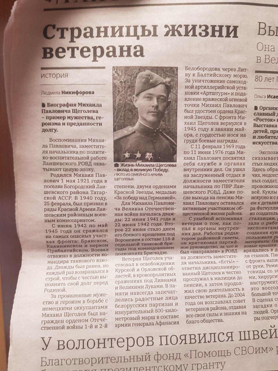 Щеголев Михаил Павлович родился в 1921 году в селе Богородское Пестречинского кантона ТАССР. Русский.