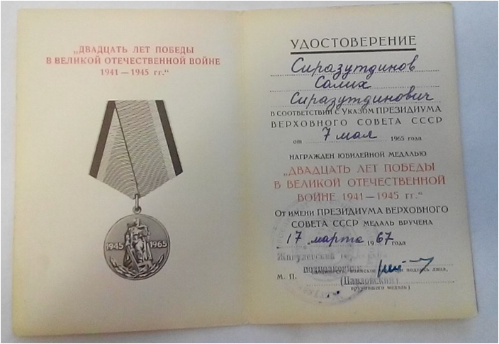 "Я, Сиразетдинов Салих Сиразетдинович родился 18 марта 1927 года в деревне Татарский Елтань Чистопольского района ТатАССР в простой крестьянской семье пятым мальчиком. В 1935 году пошел в школу и окончил 7 классов. Уже с раннего возраста мы, дети Советского Союза, понимали, что нужно помогать родителям. Так, я до 1944 года работал в колхозе.
