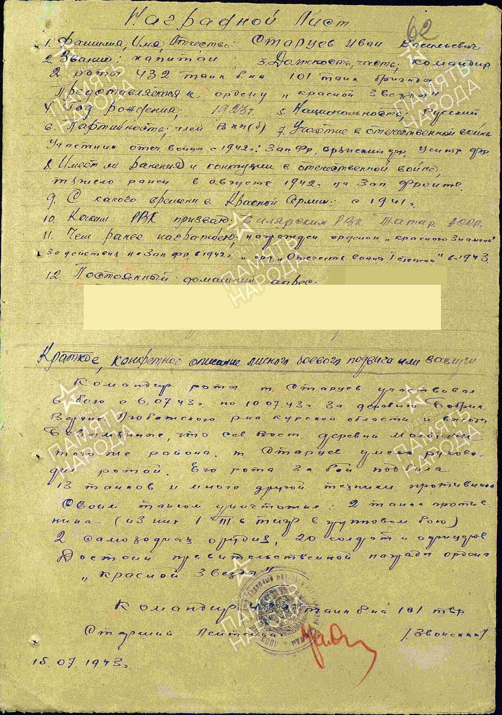 СТАРЦЕВ Иван Васильевич, 1923, д. Берёзовка. Мобилизован Билярским РВК в 1941. В марте 1942 окончил Казанское танковое уч-ще с присвоением звания «лейтенант». В 1943 – ст. лейтенант, в 1944 – капитан. Член ВКП(б). С июня 1942 воевал на Западном, Брянском, Центральном, Южном, 4 Украинском фронте в составе 65 А/ 2 ТА/ 70 А/ 51 А. В боях перенёс три ранения. Проходил лечение в ЭГ 283, г. Елец, Орловская обл, ЭГ 1748, г. Рязань, ЭГ 3135, г. Москва. Участник битвы на Курской дуге, освобождения Украины и Крыма. Ком. танка 433 отд. танкового батальона/ ком. роты 432 отд. танкового батальона/ офицер связи 101 отд. ТБр 19 ТК. Награждён двумя орденами Красной Звезды, орденами Красного Знамени, Отечественной войны 1 ст. Погиб 9 мая 1944, г. Симферополь, Крымская АССР.