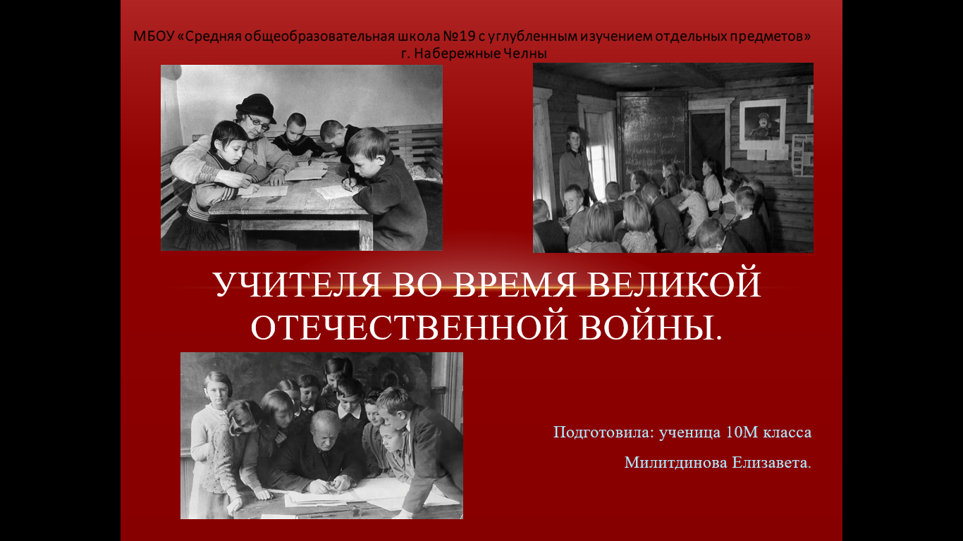 Музей «Преодоление» МБОУ «СОШ №19 с углубленным изучением отдельных предметов» Автозаводского района города Набережные Челны приглашает вас на виртуальную выставку исследовательских работ учащихся, посвященную 75-летию Победы в Великой Отечественной войне. Представляем вашему вниманию работу обучающейся 10 класса Милитдиновой Елизаветы "Учителя в годы Великой Отечественной войны".
