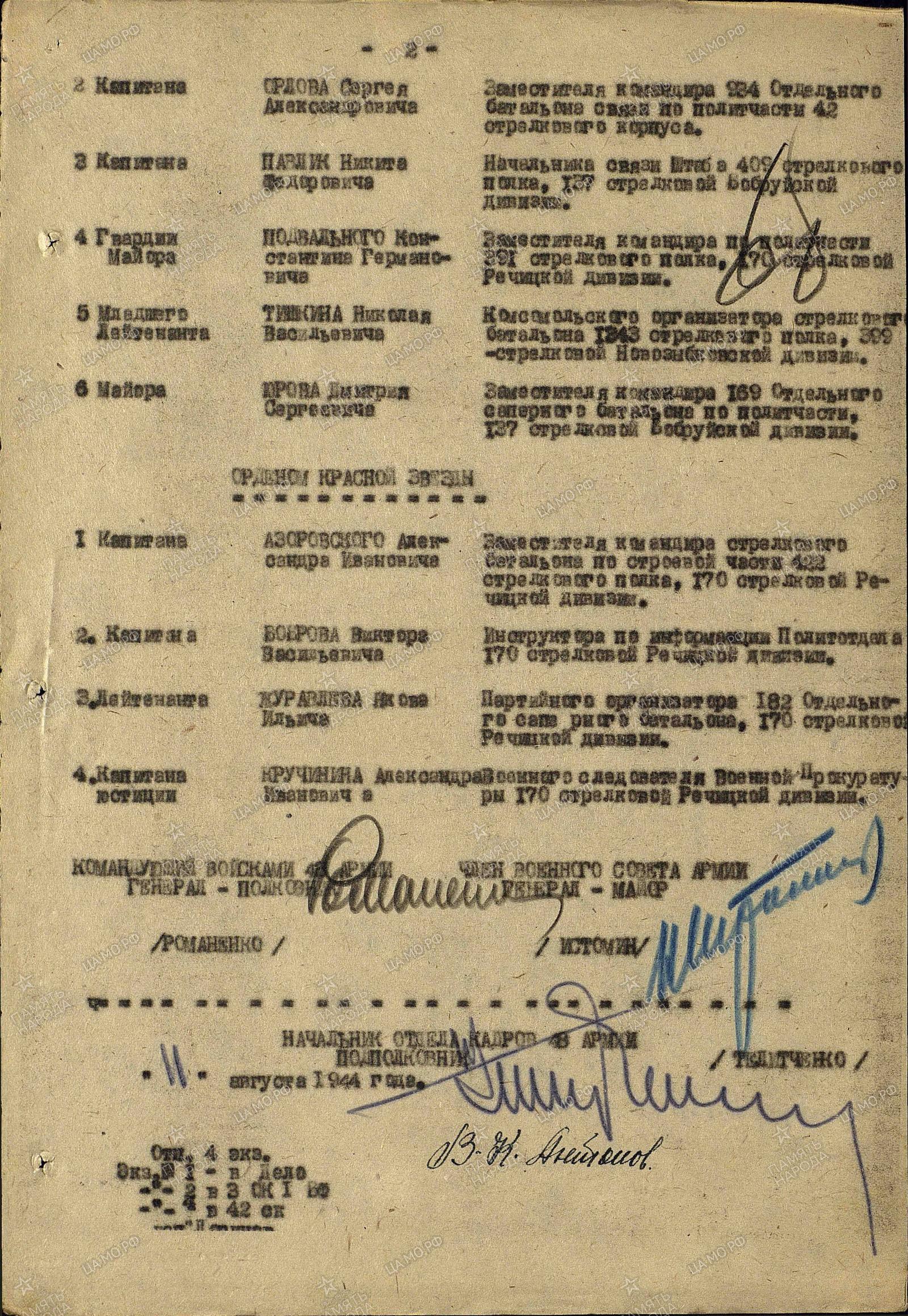 Родина высоко оценила ратный подвиг сапера: он награжден орденами Красной Звезды, Отечественной войны II степени, медалями «За отвагу», «За взятие Кенигсберга». Не paз за отличные боевые действия получал благодарность Верховного Главнокомандующего.