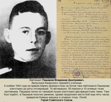 Герою Советского Союза, командиру танкового взвода лейтенанту Паширову Валентину Дмитриевичу было всего 20 лет. Он погиб 6 ноября 1943 года на правом берегу Днепра в бою за населенный пункт Хотив.