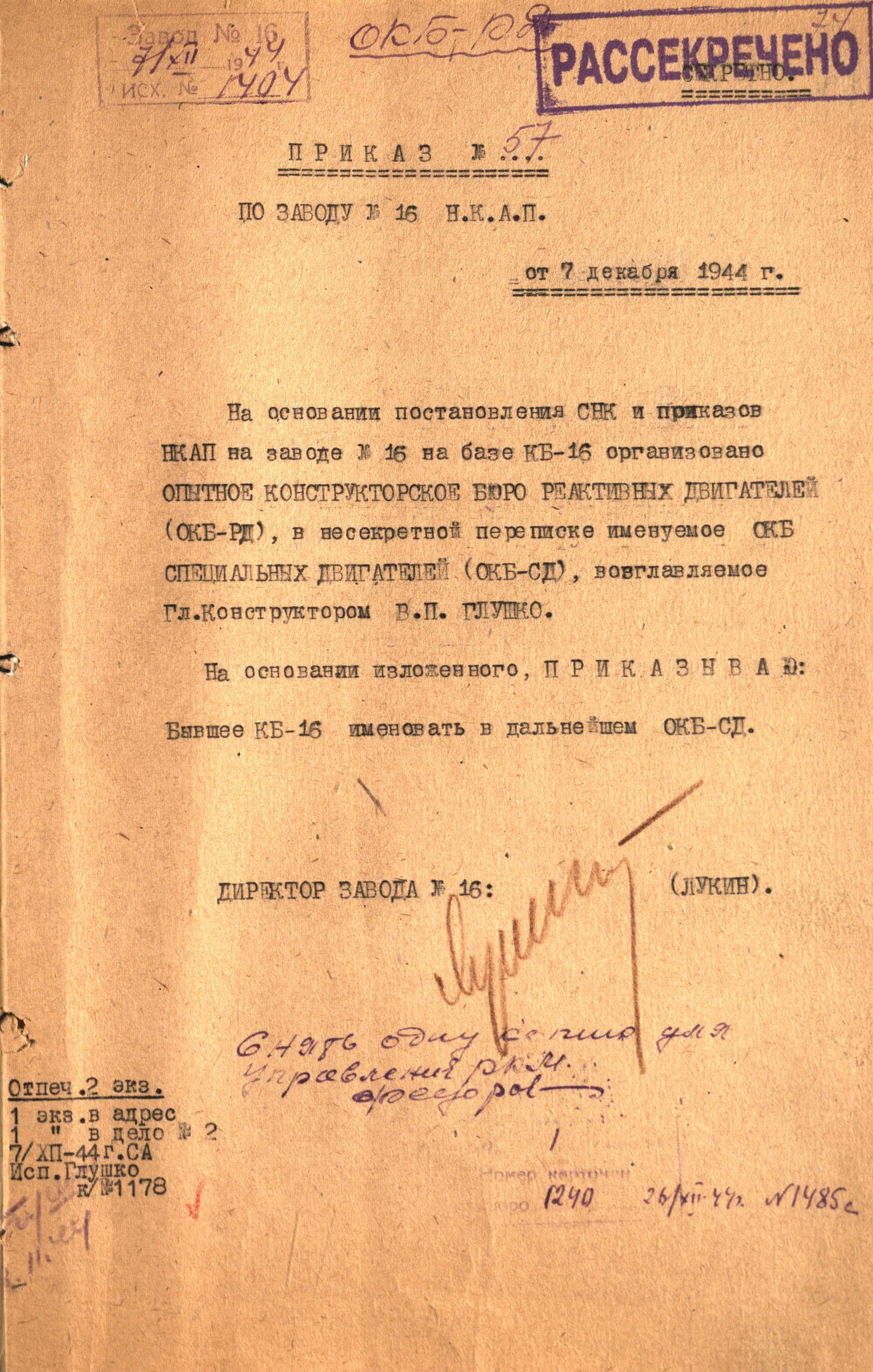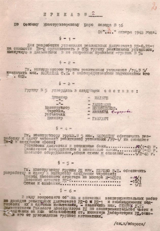 В 1940 г., после пересмотра дела, С.П. Королева перевели с Колымы к А.Н. Туполеву в Московское Конструкторское Бюро при НКВД, где репрессированные авиационные специалисты создали фронтовой бомбардировщик Ту-2. В ноябре 1942 г. С.П. Королев был переведен в Казань на авиамоторостроительный завод №16, где под руководством В.П. Глушко велись работы над ракетными двигателями новых типов с целью применения их в авиации.