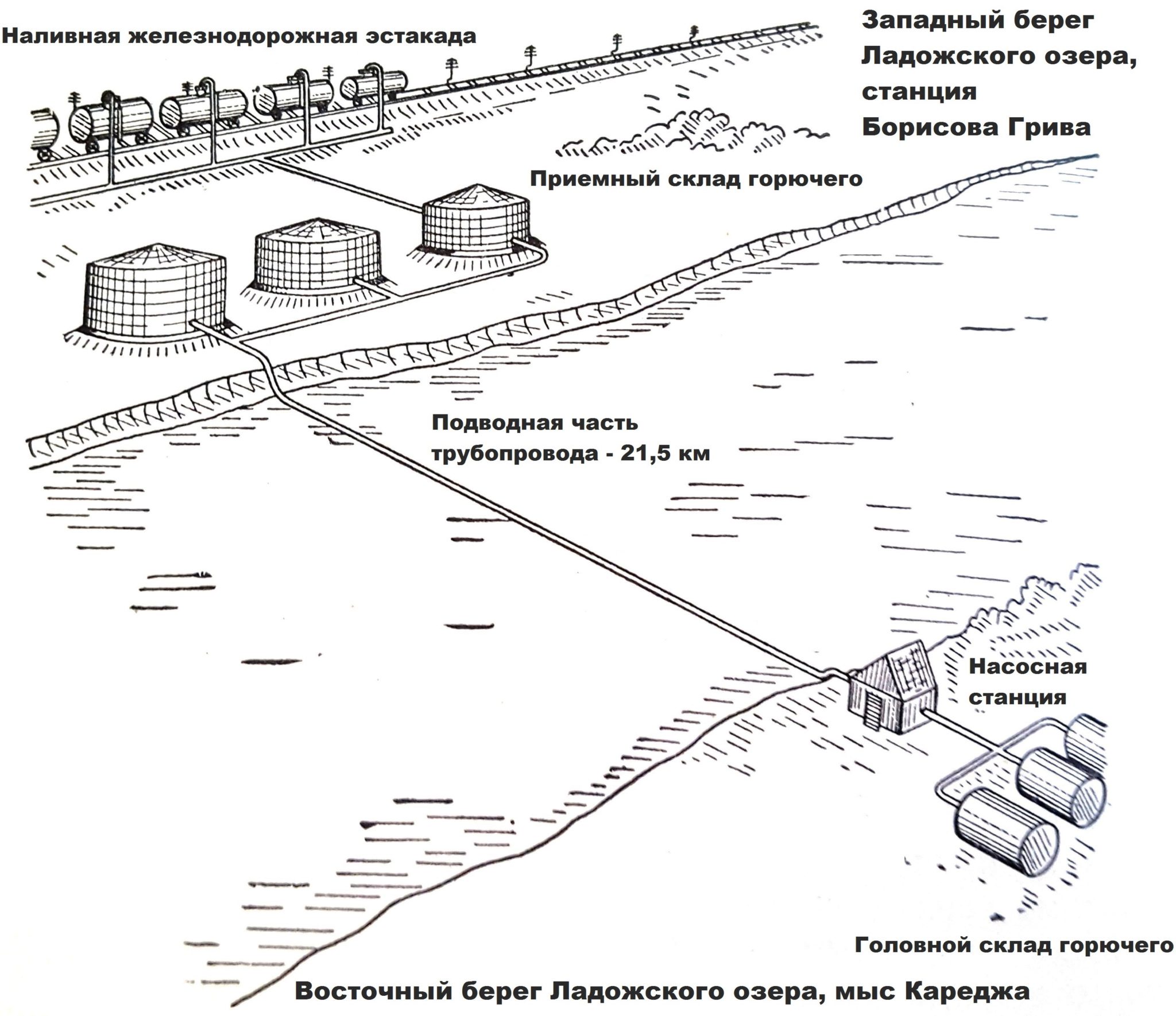 Решение о прокладке трубопровода было принято в апреле 1942 года. Правительство дало строителям 50 дней на его сооружение. Трубопровод длиной 29 километров (в том числе — 21 км под водой) был построен за 43 дня (5 мая — 16 июня 1942 года) — от мыса (косы) Кареджи на восточном берегу Ладожского озера (пункт приёма горючего с железной дороги) до железнодорожной станции Борисова Грива на западном берегу озера (в 45 км от Ленинграда). Трубопровод был стальной и проходил по дну на глубине до 13 метров.