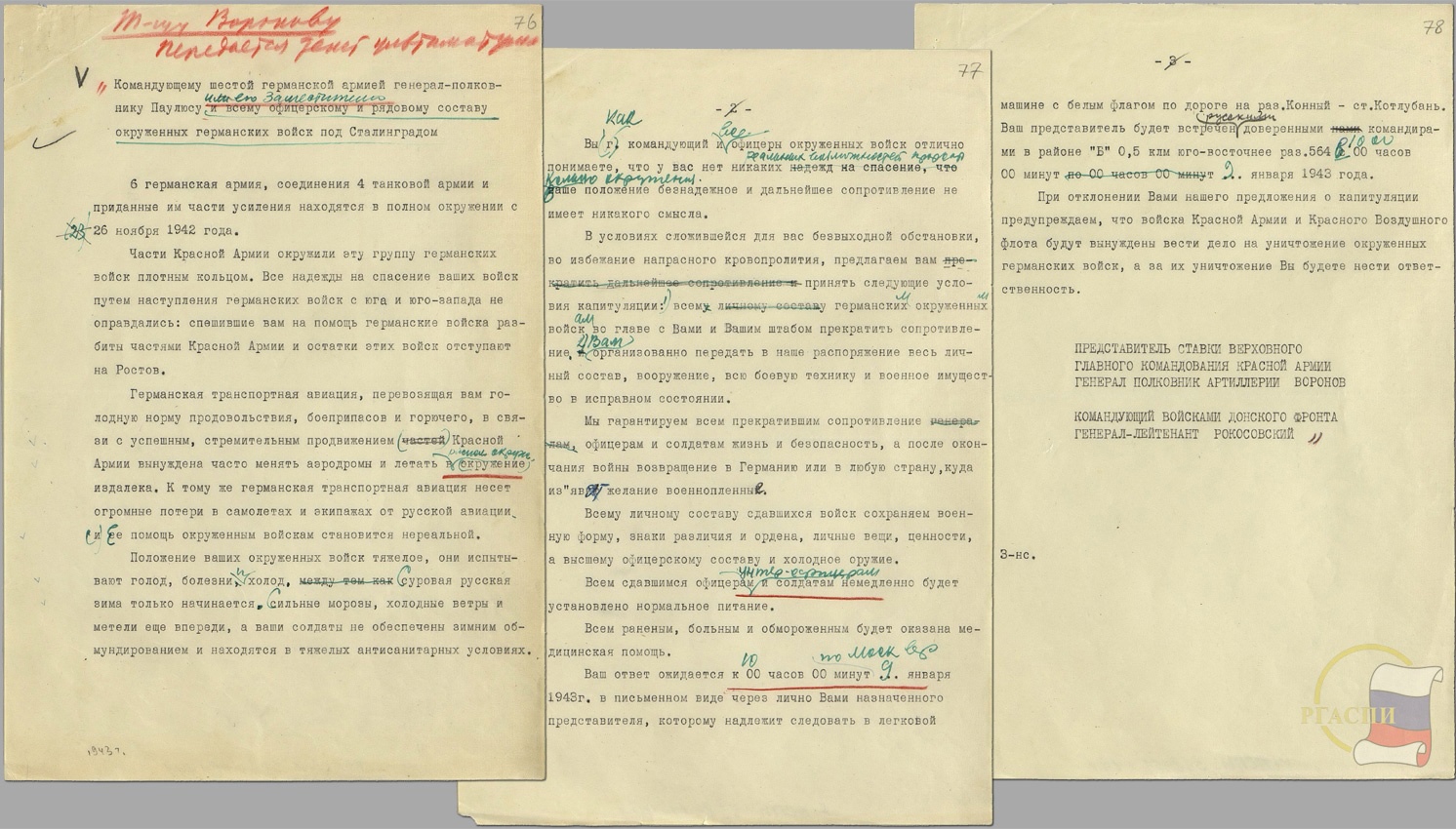 6 января 1943 г. по распоряжению И.В. Сталина в штаб Донского фронта из Ставки Верховного Главнокомандования был передан текст ультиматума командующему 6-й германской армией генерал-полковнику Паулюсу. В нем констатировалось, что немецкие войска под Сталинградом окружены плотным кольцом, все надежды на спасение и помощь не оправдались. Советское командование обращало внимание на тяжелое положение окруженных – голод, болезни, холод и антисанитарные условия. В этой безвыходной ситуации противнику предлагалось прекратить сопротивление. Всем сдавшимся в плен гарантировали жизнь и безопасность, нормальное питание и медицинскую помощь, а после окончания войны – возвращение на родину. Гарантировалось сохранение военной формы, знаков различия и орденов, личных вещей и ценностей, высшему офицерскому составу – холодного оружия. Под ультиматумом стояли подписи представителя Ставки генерал-полковника артиллерии Н.Н. Воронова и командующего войсками Донского фронта генерал-лейтенанта К.К. Рокоссовского.