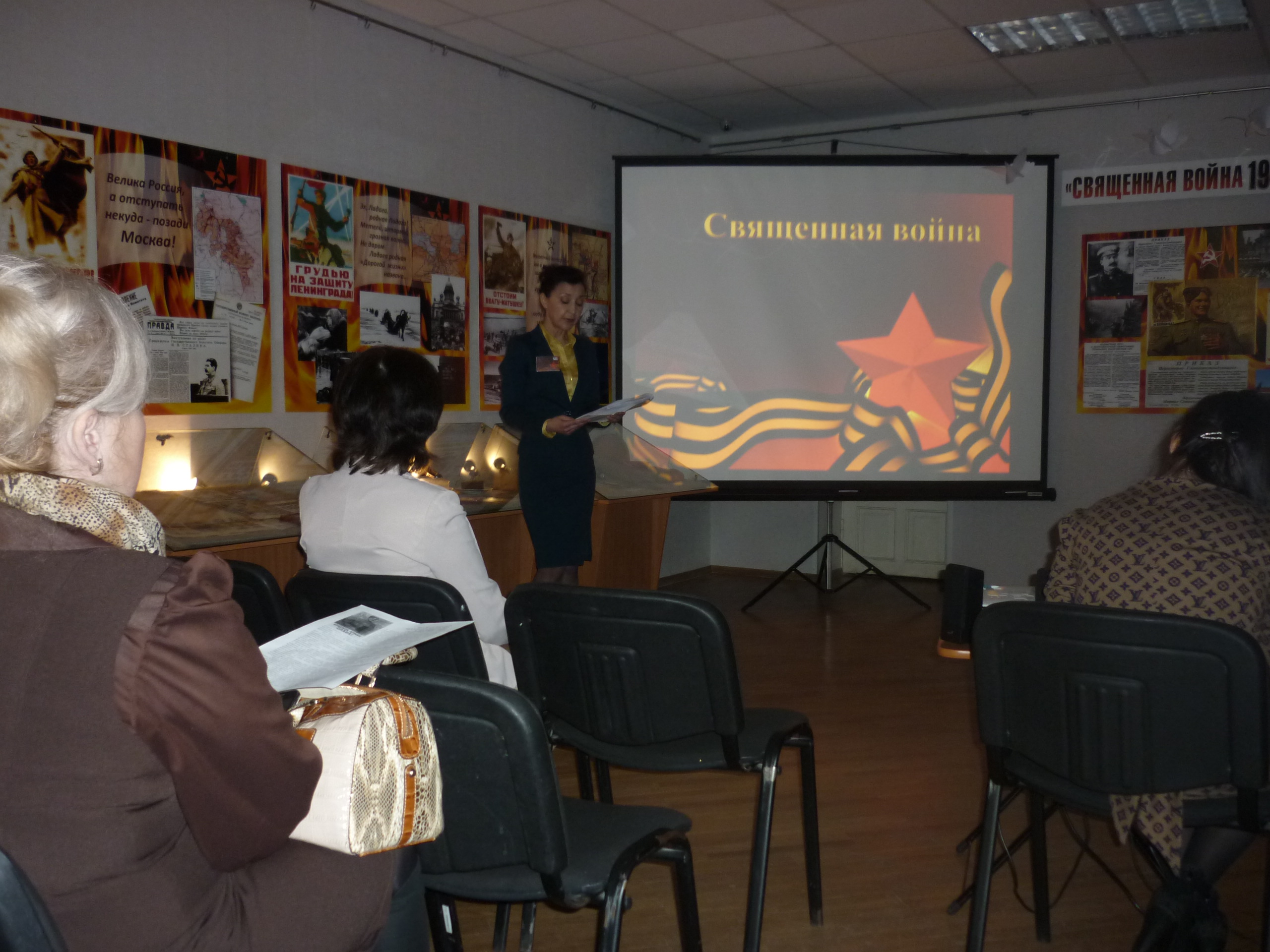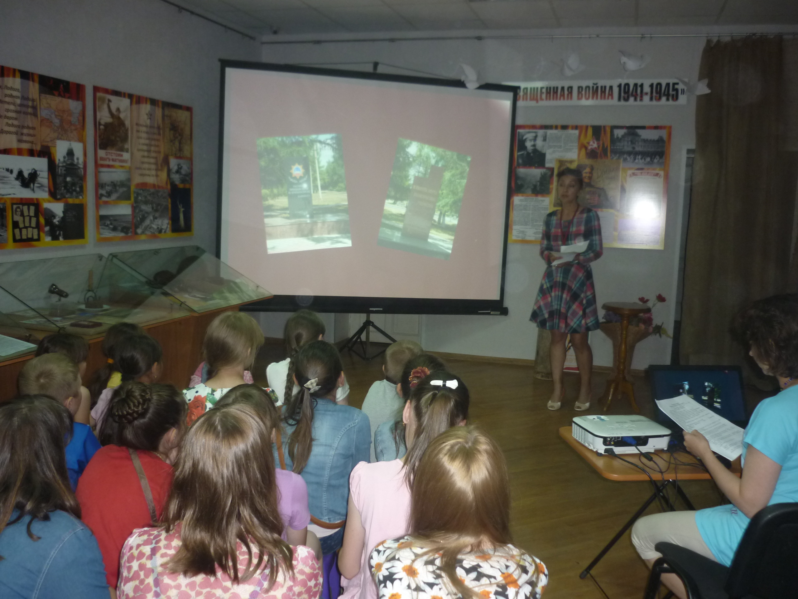 На фоне выставки проводится лекция-презентация «Диалоги о войне». Лекция сопровождается демонстрированием на экране фотографий, документов, хроникальных записей. Звучат песни военных лет, зачитываются фронтовые письма, страницы дневников очевидцев военных событий, стихи. В повествовании делается акцент на вклад татарстанцев в великую Победу. Цель этой лекции - вовлечь слушателей во внутренний диалог с собой, со своим дедом, прадедом, с неизвестным солдатом, павшим на полях сражений. Апофеозом лекции является обращение с экрана солдата Второй мировой к его ровесникам, живущим в XXI веке. Свет гаснет, зажигается свеча и на экране пролистываются виды мемориалов памяти, расположенных в сёлах и деревнях нашего района с цифрами, отражающими количество ушедших на фронт и не вернувшихся с войны наших земляков.