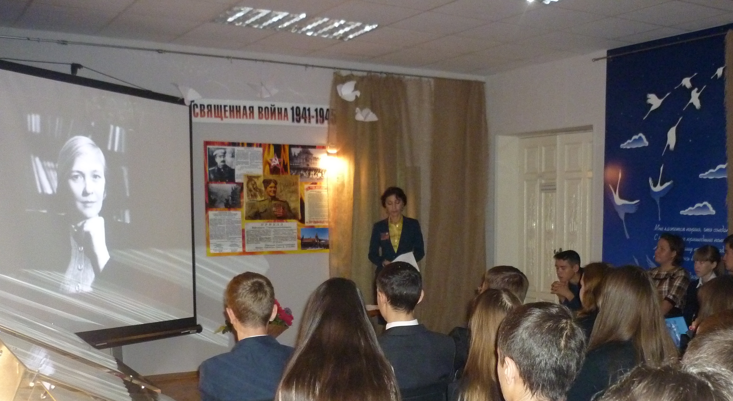 После построения все участники акции были приглашены на «Диалоги о войне». В ходе лекции - презентации ребята и взрослые погрузились в атмосферу военного времени. Во время лекции - презентации в зале была полная тишина, но мы уверены - диалог состоялся.
