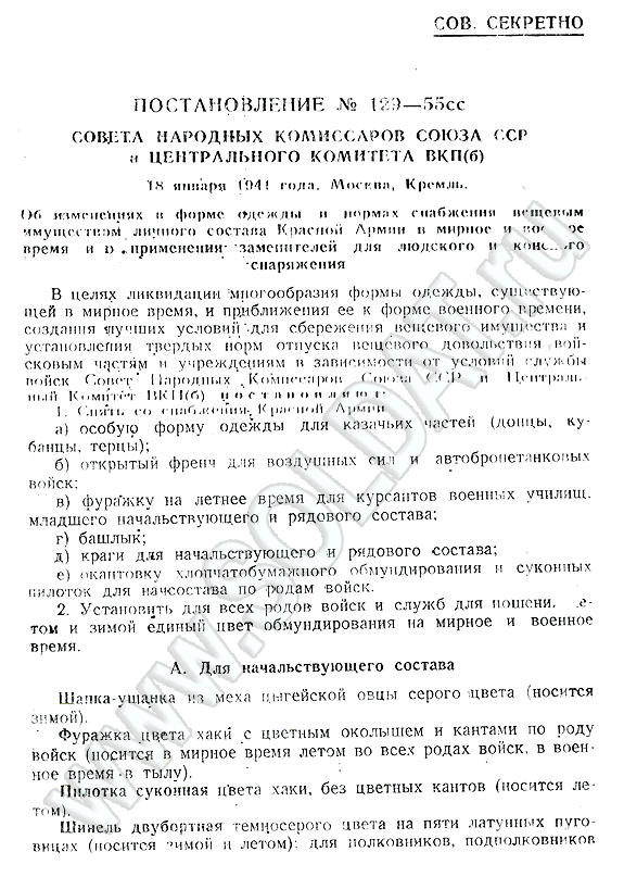 18 января 1941 г. СНК СССР и ЦК ВКП(б) прияли совместное Постановление №129-55сс "Об изменениях в форме одежды и нормах снабжения вещевым