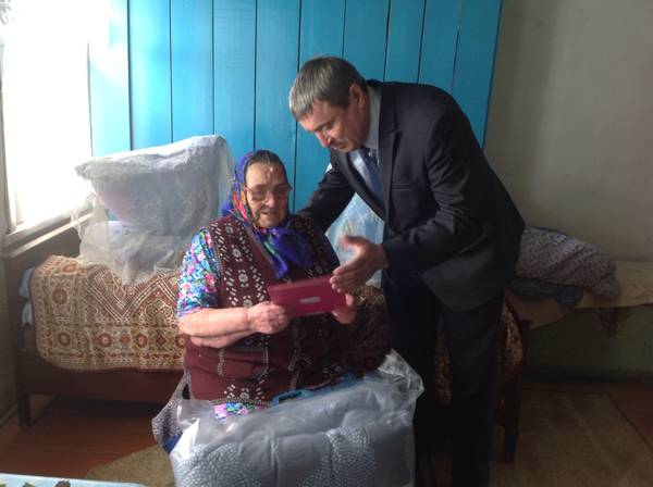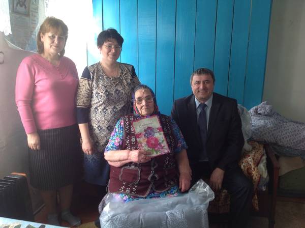 Поздравить ее с таким прекрасным праздником приехали заместитель главы района Рашит Билалов, заместитель руководителя Исполнительного комитета по социальным вопросам Мария Платонова, секретарь Юхмачинского сельского поселения Валентина Ларионова. Руководство района пожелали бабушке крепкого здоровья, долго летия и вручили памятный подарок.