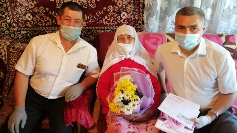 Миннегульсем Сабирзяновне были вручены цветы, памятные подарки и поздравления от Президента РФ В.В.Путина.