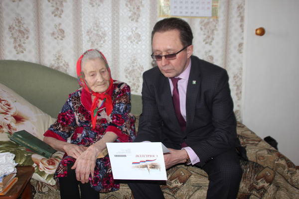 От имени Президента РФ Владимира Путина и главы Актанышского муниципального района Фаиля Камаева юбиляра поздравил руководитель Аппарата Совета района Айдар Хаев. Он поздравил юбиляра и пожелал ей всего самого наилучшего.