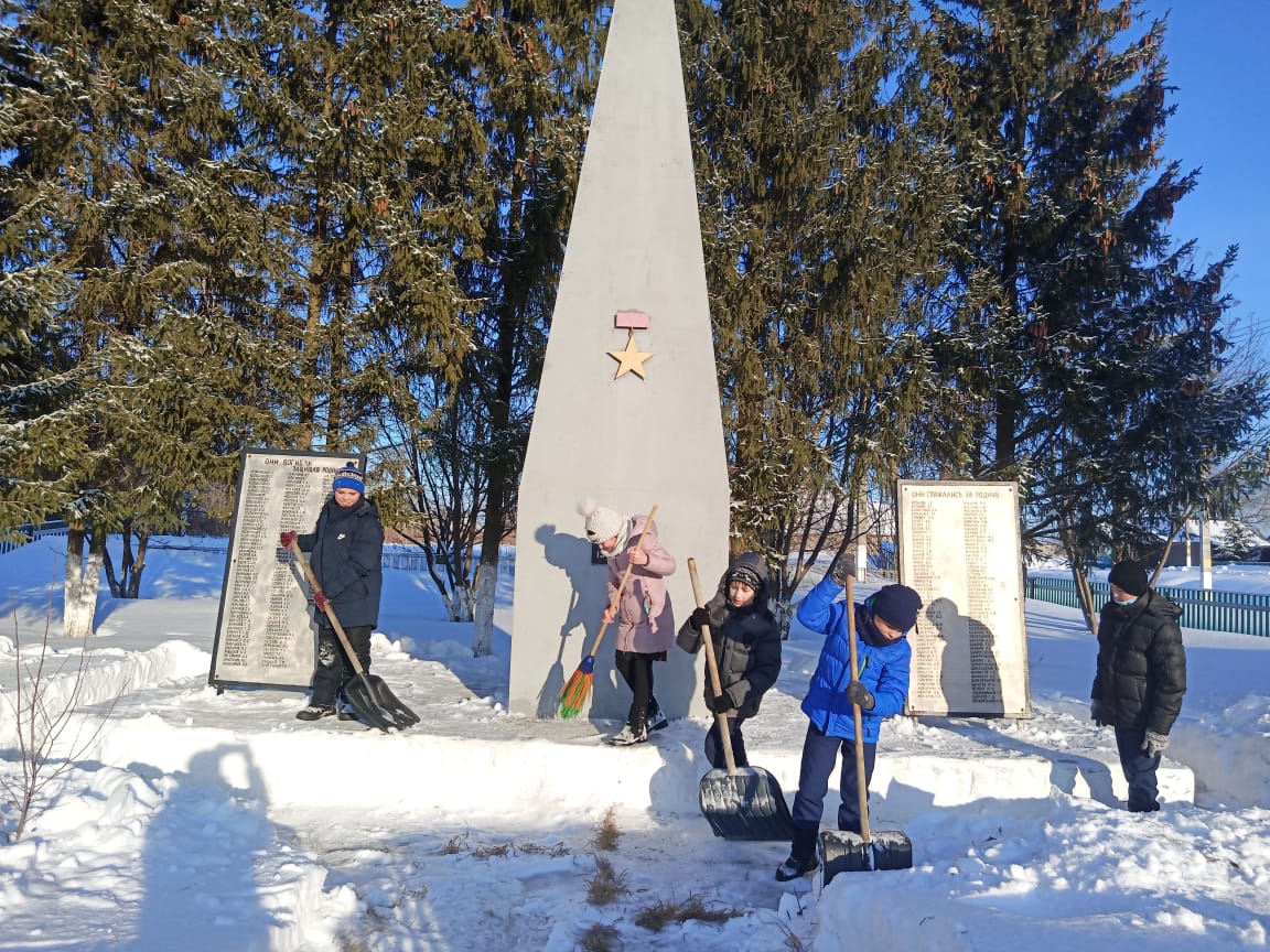 В этот день читатели Тат. Беденьгинской поселенческой библиотеки совместно с ведущим библиотекарем Гульфией Мавлютовой провели акцию «Место Памяти» и очистили от снега территорию обелиска.