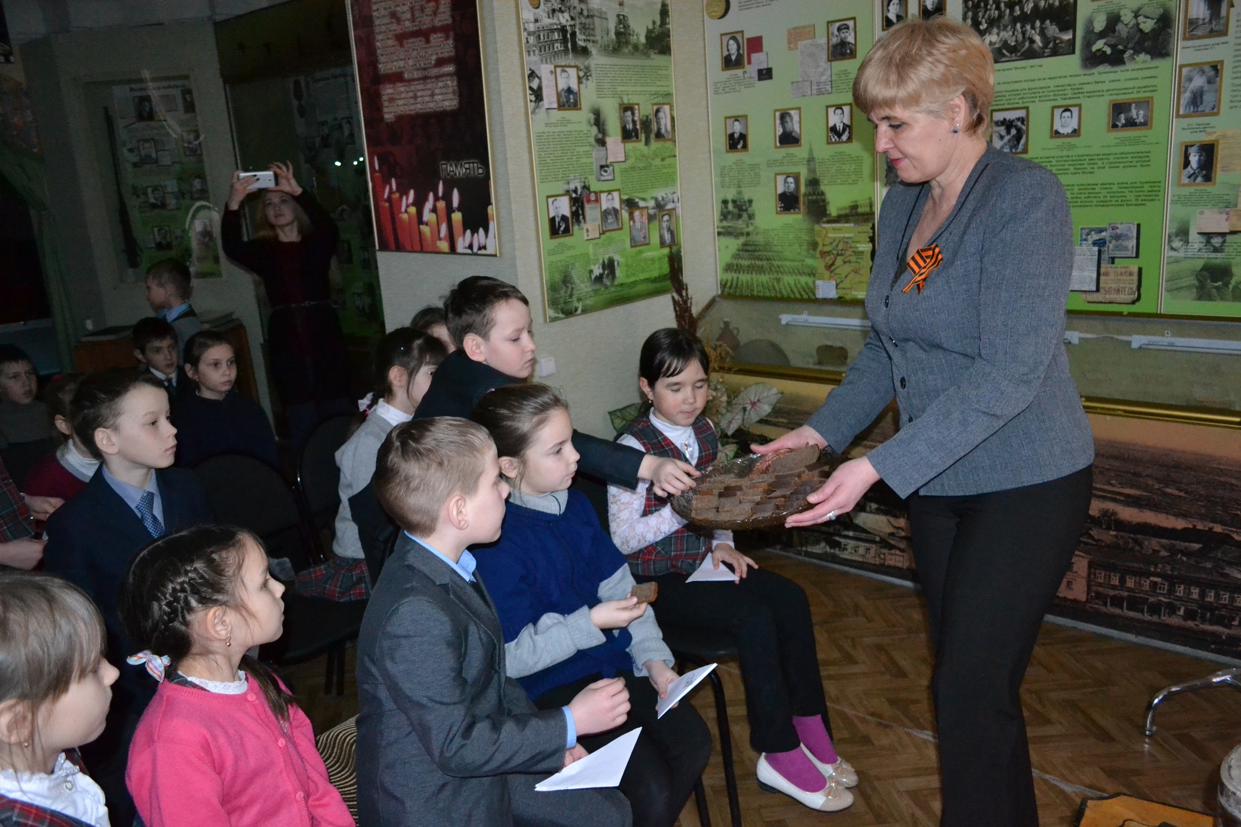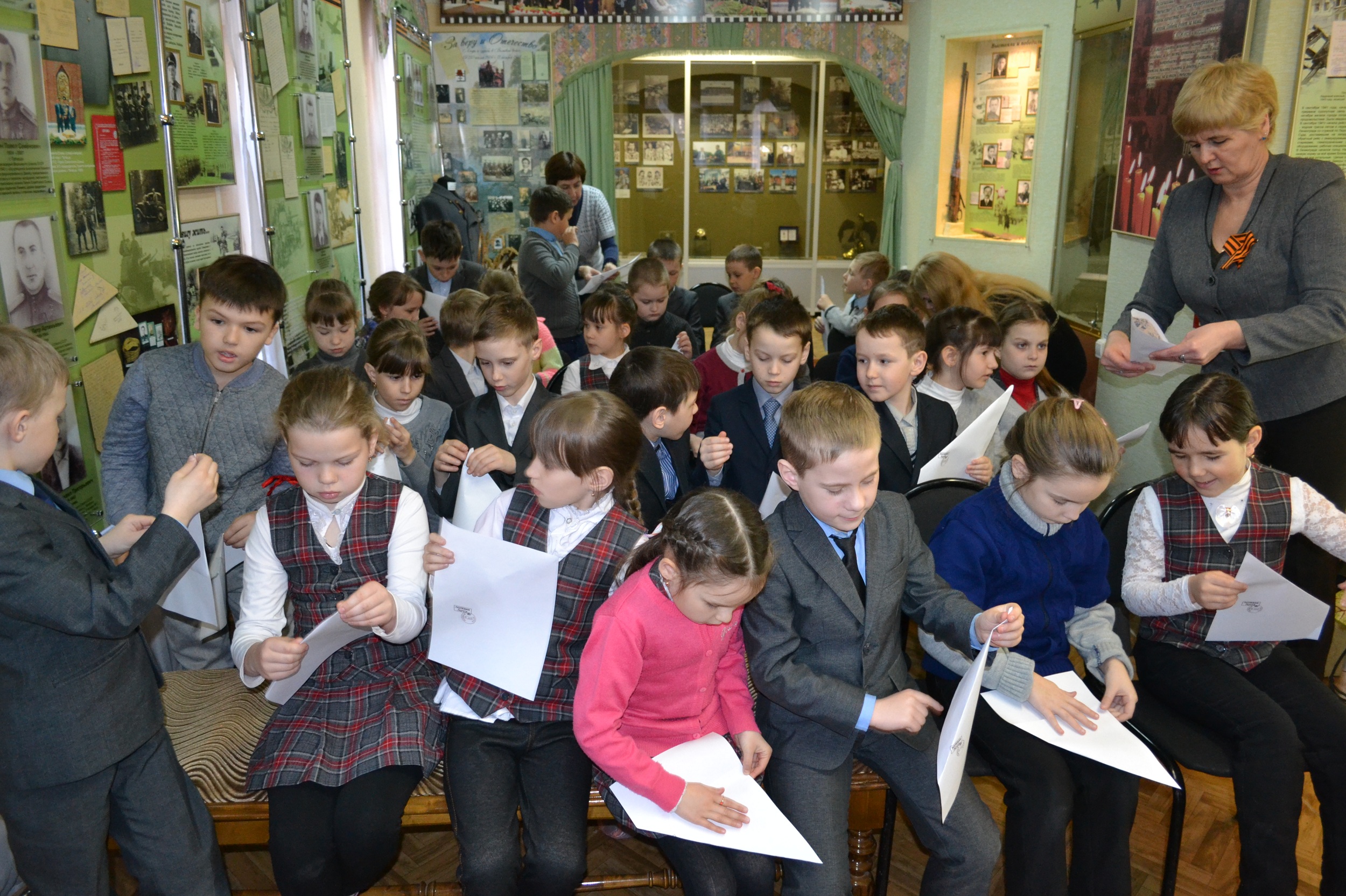 Одними из посетителей в рамках акции были учащиеся 2 «В» класса ТСОШ №1 (кл.рук. Канаева Н.Н.) на обзорной экскурсии по выставке «О тех, кто выстоял и победил». Детям было интересно своими глазами увидеть подлинные реликвии военных лет: письма, фляжки, котелки, хлебные карточки и кусочек хлеба в 125 граммов, который получали жители страны во время войны. Изюминкой встречи для детей стали интерактивные моменты – попробовать кусочек «блокадного» хлеба и сложить фронтовое письмо – треугольник. Эти письма с добрыми пожеланиями дети вручат ветеранам в День Победы.