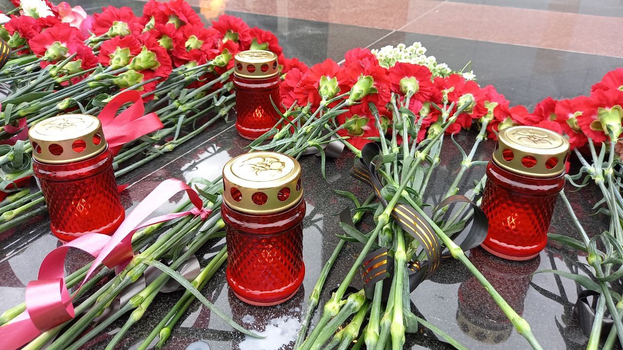 Жители города зажигали свечи и возлагали цветы к военным мемориалам.