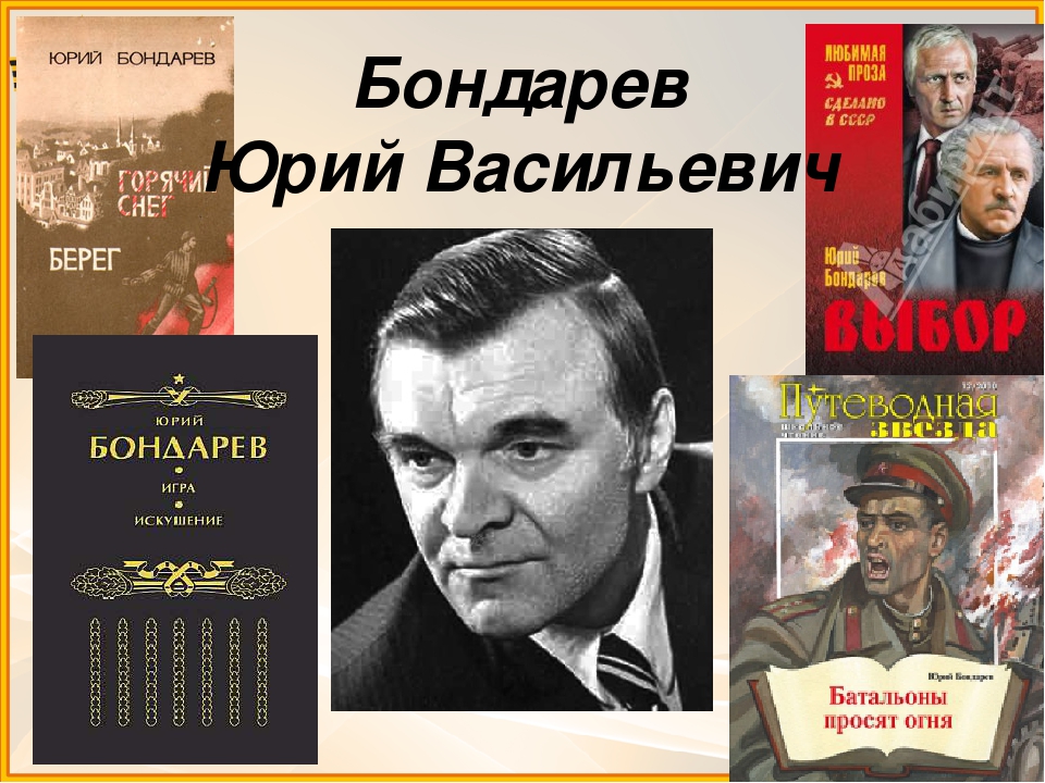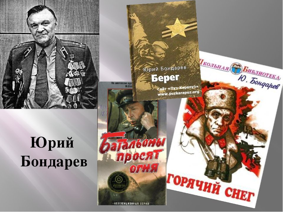 Юрий Васильевич Бондарев. Едва закончив школу, мальчишки становились в годы Великой Отечественной войны защитниками родины, взвалив на свои плечи тяжелый груз войны. Одним из представителей этого поколения является писатель Юрий Васильевич Бондарев. Он родился 15 марта 1924 года. Главное испытание характера будущий писатель получил на войне. В1941 году комсомолец Юрий Бондарев вместе с тысячами молодых москвичей участвовал в сооружении оборонительных укреплений под Смоленском. Именно на фронте в сознание Ю.Бондарева окончательно вошли кристально чистые и ясные заповеди любви к Родине, порядочности и верности. Ведь в бою все обнажено и очевидно: что есть добро, а что –зло. И там же на войне писатель понял главное: «Человек рождается для любви, а не для ненависти»». По литературным произведениям Ю.Бондарева сняты художественные фильмы: «Последние залпы», «Горячий снег», «Батальоны просят огня», кино-эпопея «Освобождение». Его проза переведена на 70 языков народов мира.
