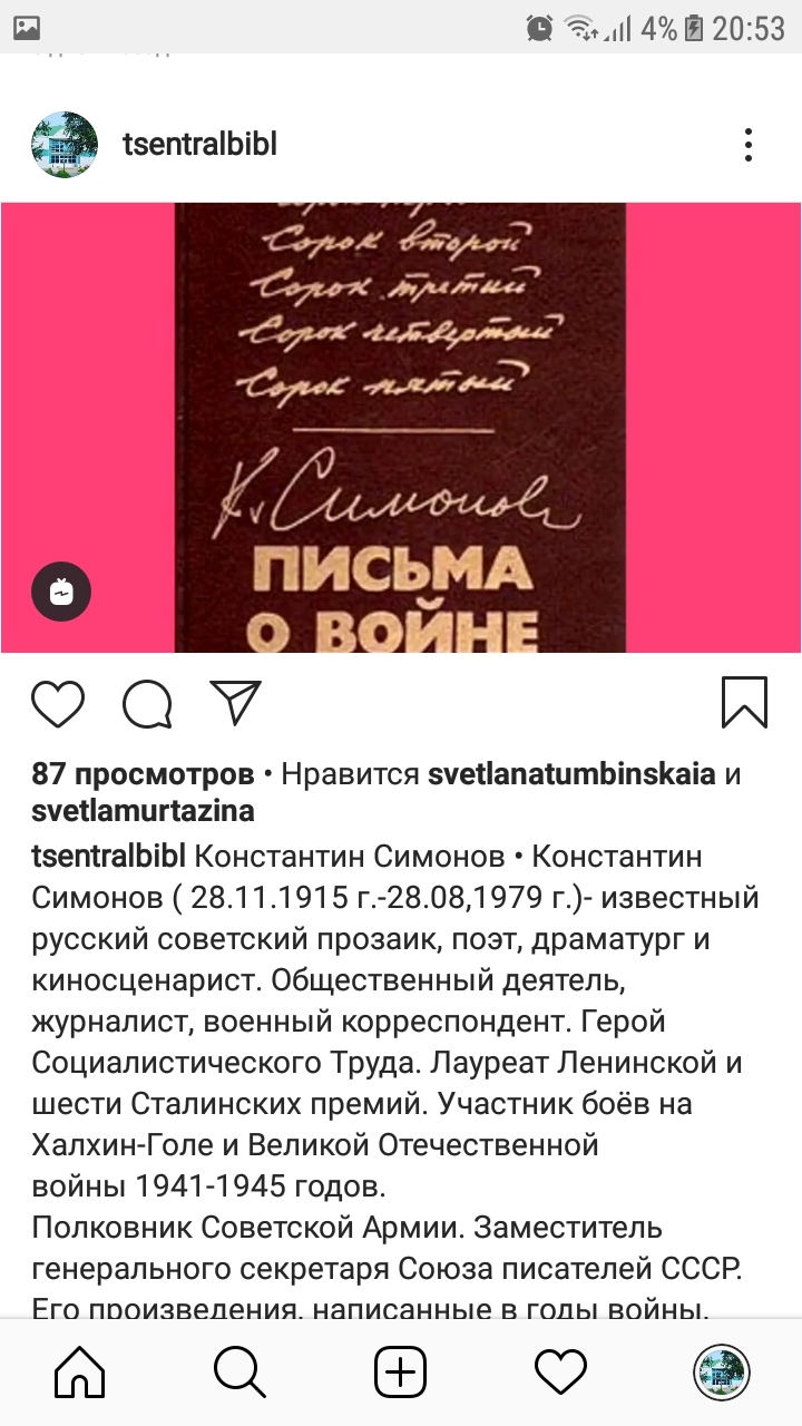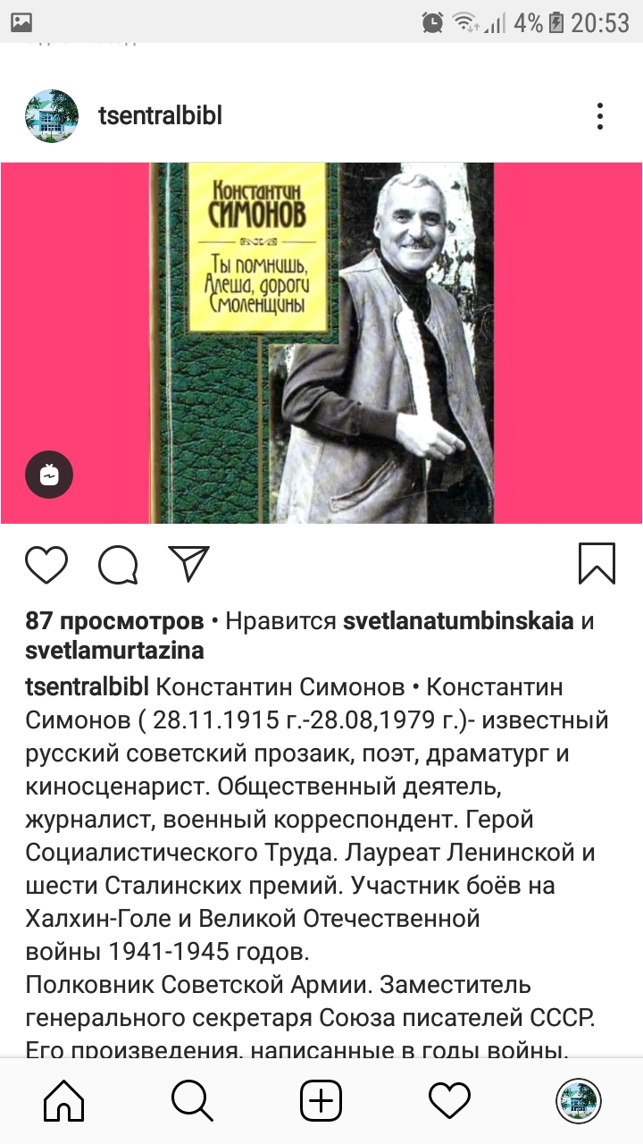 На аккаунте в Инстаграме Центральная библиотека села Черемшан опубликовала цикл презентаций, посвященных писателям-фронтовикам: Константин Симонов, Юрий Бондарев.