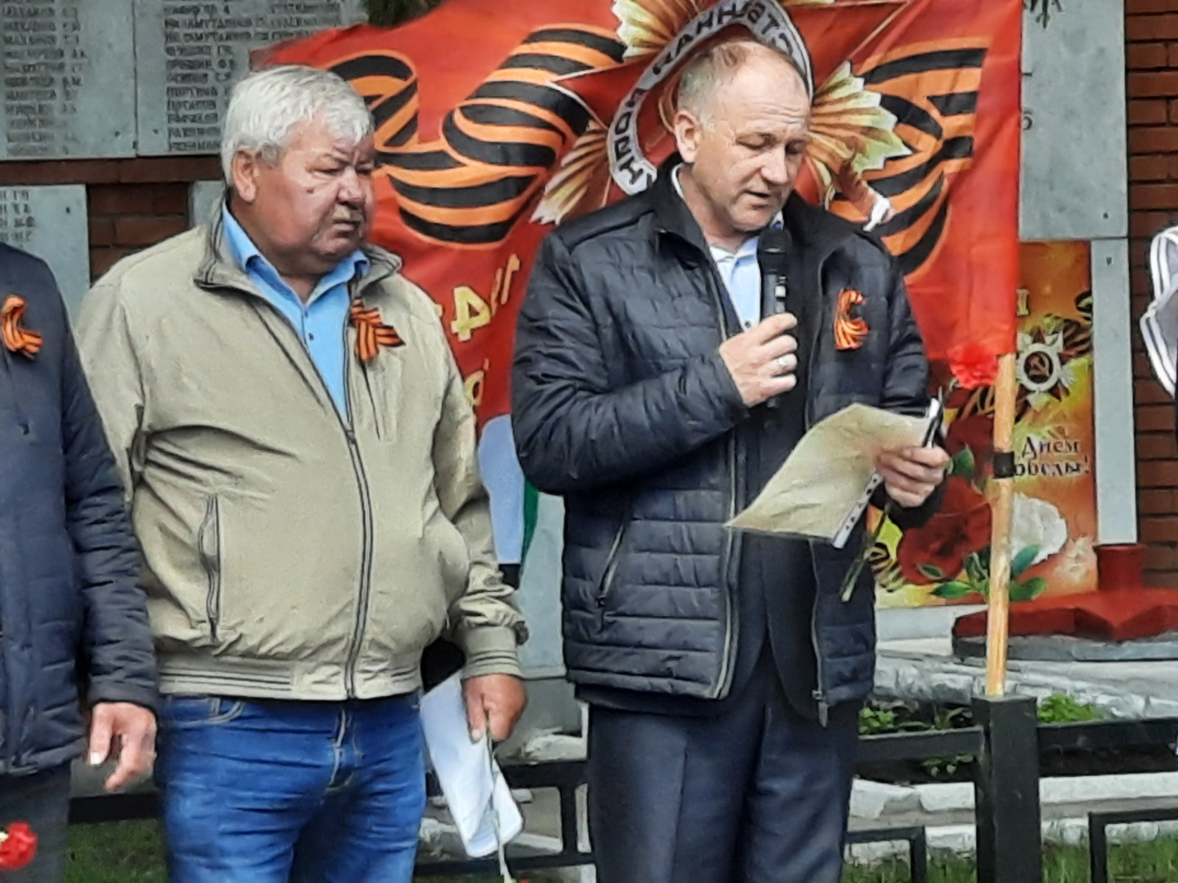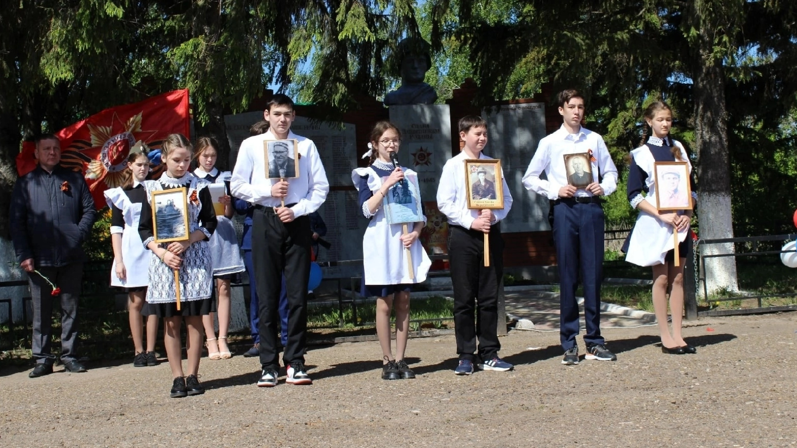 Участники митинга почтили минутой молчания всех павших на полях сражений и умерших в мирное время ветеранов. К подножию обелиска были возложены гирлянды, у которого стояли в почётном карауле школьники.