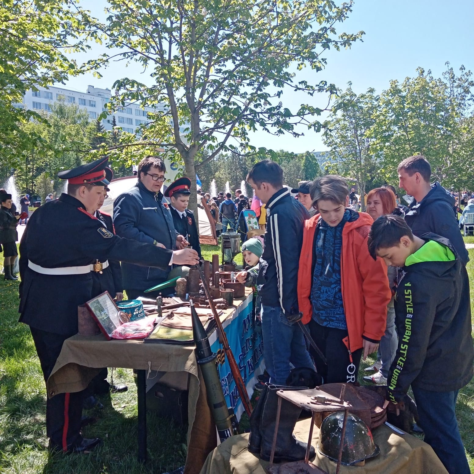 Музейная экспозиция, под руководством руководителя школьного музея Насыровой В.Р. и учителя истории и обществознания Арсланова А.П., разместилась на бульваре Энтузиастов. Кадеты - экскурсоводы: Сафин Ильшат, Тартаринов Кирилл и Гайсин Рамзан провели экскурсии для гостей и жителей города. Рассказали о деятельности поискового отряда «Каймановцы», об истории представленных экспонатов и о жизни фронтовика и первостроителя КамАЗа - Квациона Льва Васильевича. Для желающих была организована фотозона, где каждый мог примерить стальной шлем советского солдата и запечатлеть себя с оружиями Великой Отечественной войны: карабином Мосина, ручным пулеметом Дегтярева и станковым пулеметом Максима