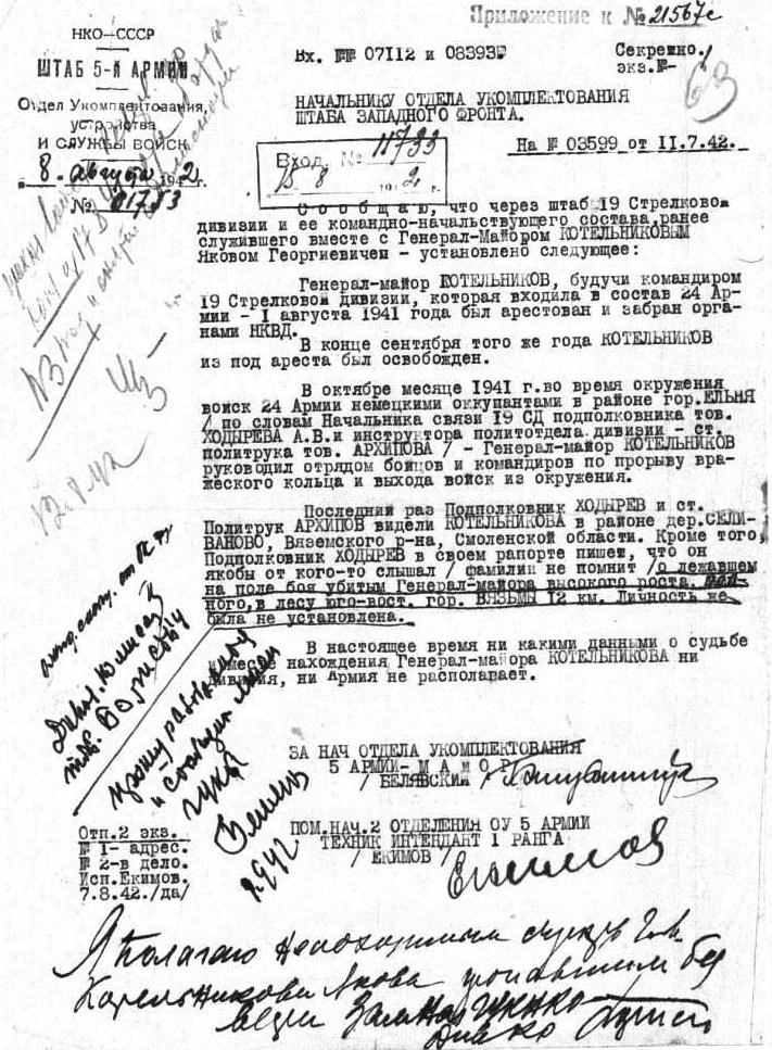Судьба деда трагична. Когда при планировании линии обороны советских войск под Ельней он указал командующему фронтом Константину Георгиевичу Жукову на наличие незащищённых участков, в то военное время это было воспринято Жуковым как пререкание со старшим по званию, а, значит, нежелание выполнять приказание. За свою честность Котельников был отправлен в НКВД, где, пока шло разбирательство, провёл почти месяц, – с горечью отмечает Ольга Борисовна. – Там дед находился почти весь август и начало сентября – его лишили должности командира 19 СД и наград, а командовать 19-й дивизией Жуков поставил Утвенко, произведя его из майора сразу в полковники. Самое обидное, что Жуков и Котельников ранее были друзьями, вместе учились в военной академии. После разбирательства дед был восстановлен в звании, и в начале сентября 1941 года он вернулся в армию, но 19-й СД уже командовал другой. Тогда командующий 24-й армии Ракутин назначил Котельникова своим заместителем.