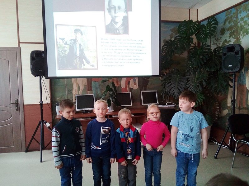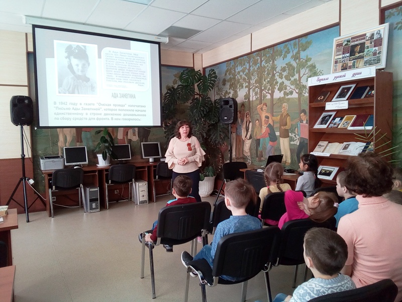 Очередное мероприятие провели сотрудники детской библиотеки для воспитанников детских садов. Дети посмотрели видеоролик с хроникой военных лет, послушали рассказ библиотекаря Ирины Марготновой, узнали о детях-героях Великой Отечественной войны, познакомились с книгой А.Печерской «Дети – герои Великой Отечественной войны», посмотрели выставку с военными экспонатами.