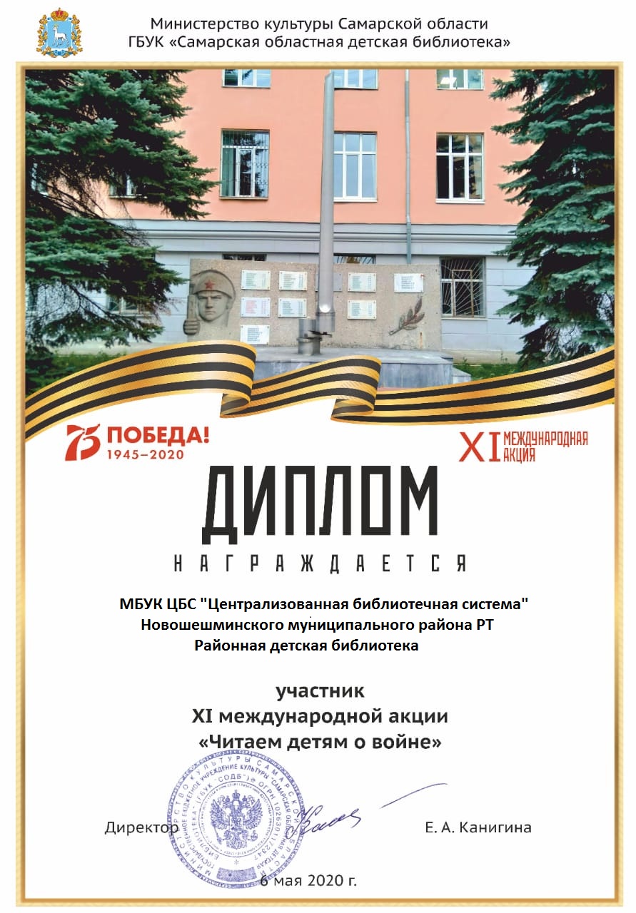 ГБУК «Самарская областная детская библиотека» в апреле 2020 г. объявила о XI Международной Акции «Читаем детям о войне», в которой приняло участие МБУК «Централизованная библиотечная система Новошешминского муниципального района РТ». Акция «Читаем детям о войне» - крупномасштабное международное мероприятие по поддержке детского чтения, идея проведения которого родилась на самарской земле. Её цель – воспитание гражданственности и патриотизма у детей и подростков на примере лучших образцов детской литературы о Великой Отечественной войне 1941-1945 гг.