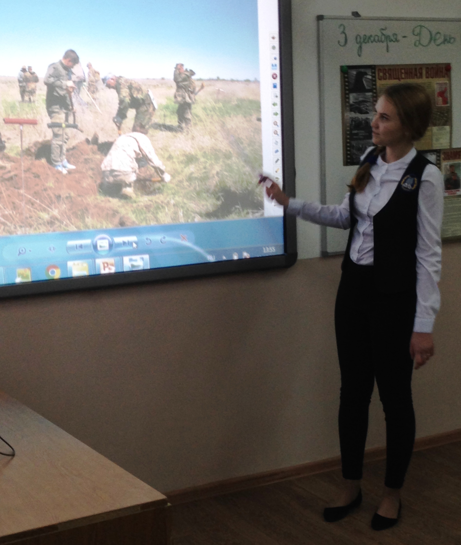 На встрече в I корпусе школы присутствовали заместители директора школы И.Ф. Якубович, В.Л. Бахадирова, учащиеся 5 «а», 6 «а» классов, офицеры и приглашённые гости – ученицы 11 класса МБОУ «Лицей № 1», члены Военно-патриотического поискового отряда "Выстрел" Ляйсан Хафизова и Юлия Квашнина. В ходе мероприятия кадеты 6 "а" класса Р. Касимов, Д.Волков рассказали об истории возникновения новой памятной даты, прокомментировали документальную фотохронику по теме. В исполнении учеников 5 «а» класса И.Моисеева, А.Болдырева, М.Потасьева прозвучало одно из пронзительных стихотворений А.Твардовского "Я убит подо Ржевом". Девушки поделились опытом поисковой работы под Волгоградом, в местах бывших боев 1-ой Гвардейской, 66 и 24 армий РККА. В частности, они рассказали о специфике организации быта в полевых условиях, правилах проведения раскопок, судьбе найденных останков героев, использовании архивных сведений, реконструкторских походах и просветительной деятельности отряда. Всем собравшимся было интересно услышать ответы на вопросы и узнать о личных впечатлениях юных поисковиков.