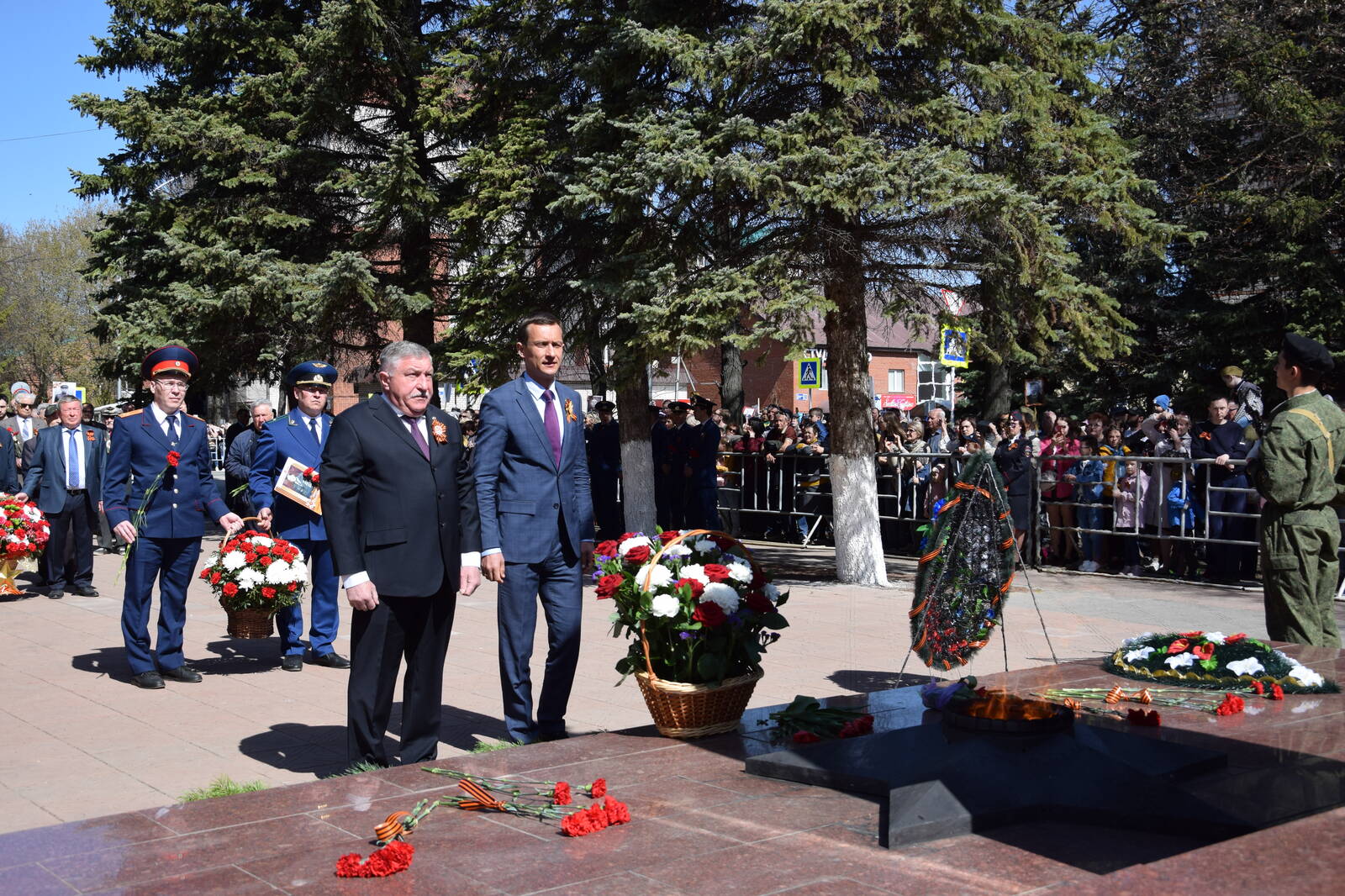 У монумента «Вечный огонь» состоялся митинг, где приняли участие Глава Лениногорского района, мэр города Лениногорск Рягат Хусаинов, министр цифрового развития Республики Татарстан Айрат Хайруллин, руководители предприятий и организаций города, представители районной администрации, члены общественных организаций, учащиеся, жители и гости нашего района. И, конечно же, ветераны Великой Отечественной войны.