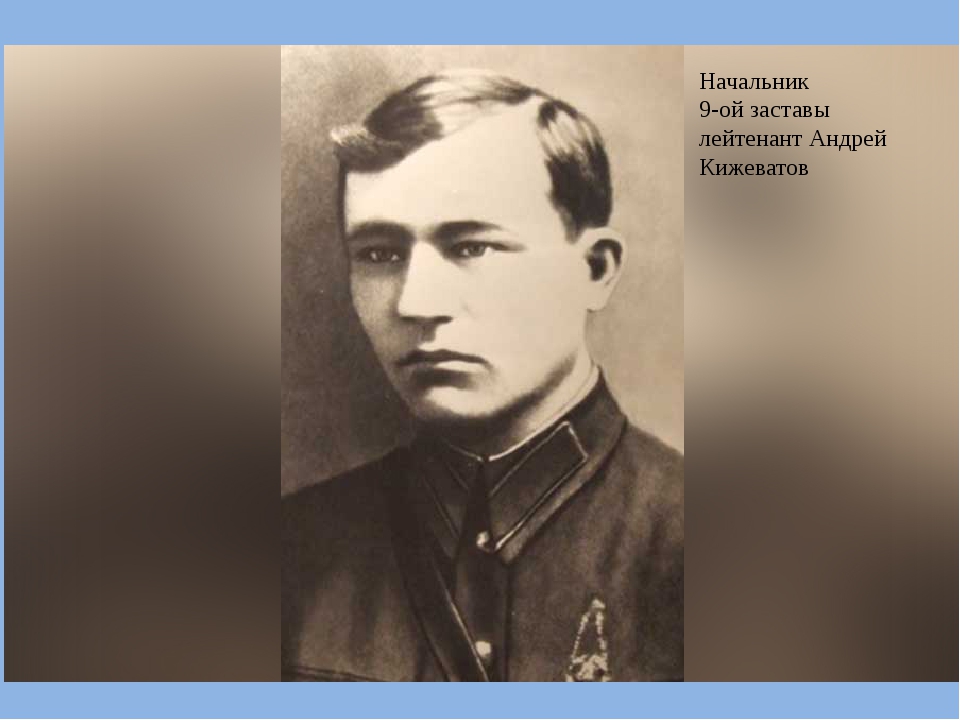 Неувядаемой славой покрыл себя гарнизон Брестской крепости, которая находилась на основном направлении главного удара немецко-фашистских войск на Москву. Немецкое командование планировало взять крепость к 12:00 22 июня. Но фашистам не удалось осуществить свои планы. В крепости им противостояли 500 пограничников, среди которых был и личный состав 9-й заставы Брестского пограничного отряда во главе с лейтенантом А. М. Кижеватовым. 45-я немецкая пехотная дивизия осаждала крепость до 1 июля, потеряв более тысячи солдат и офицеров. После этого для блокирования крепости были оставлены два батальона, которым до 20 июля оказывала сопротивление горстка наших бойцов и командиров. Об этом свидетельствует надпись, сделанная 20 июля 1941 года на стене каземата: «Я умираю, но не сдаюсь! Прощай, Родина!». Лейтенант А. М. Кижеватов погиб в крепости в июле месяце, ему посмертно присвоено звание Героя Советского Союза.